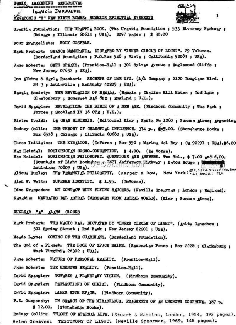 This document, authored by Ignacio Darnaude, serves as an extensive bibliographic compilation of literature focused on New Age philosophy, ufology, spiritualism, and metaphysical subjects. The document is organized into thematic sections with titles such as 'Basic Awakening Explosives', 'Nuclear A Alarm Clocks', 'Evolutive Dynamite', 'Stirring of Consciousness Grenades', 'Intensifiers of Awareness Petards', 'Inner Divine Spark Detonators', and 'Other Soul-Enlarging Weapons'. Each entry lists the author, the title of the work, and often the publisher, location, and occasionally pricing or page counts. The document covers a wide range of authors including well-known figures in the UFO and spiritualist communities such as George Adamski, John A. Keel, Jane Roberts, David Spangler, and various channeled works attributed to entities or 'inner circles'. The final page provides a comprehensive list of publishers and their addresses, facilitating access to the cited materials. The document functions as a reference guide for individuals interested in the intersection of extraterrestrial contact, spiritual evolution, and esoteric knowledge.