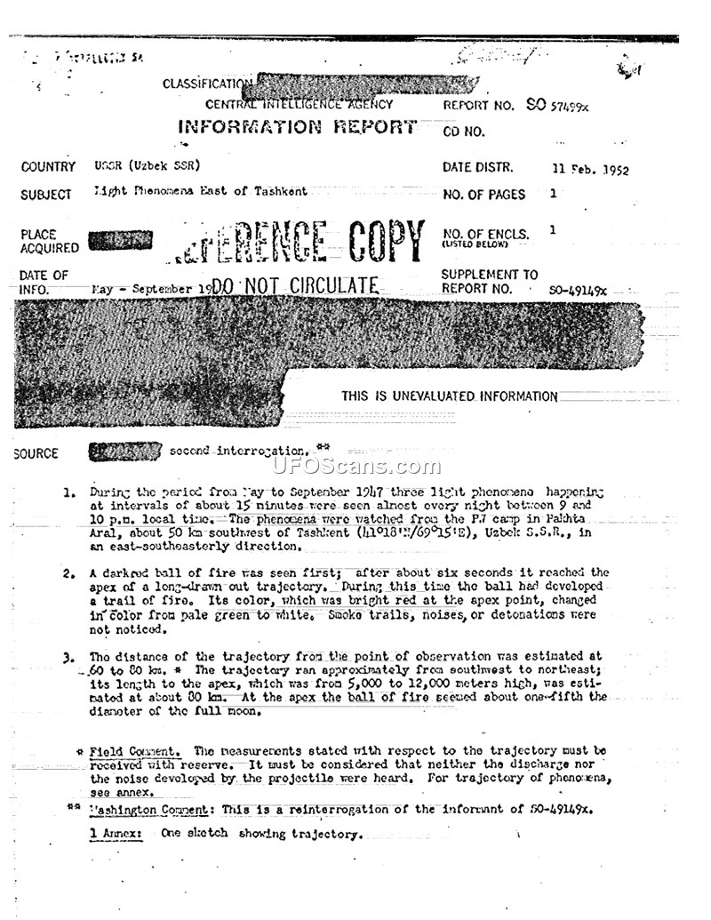 This Central Intelligence Agency Information Report, dated February 11, 1952, details a series of aerial observations made in the Uzbek S.S.R. between May and September 1947. Based on a reinterrogation of an informant previously associated with report SO-49149x, the document describes three distinct light phenomena observed near a prisoner-of-war camp in Pajhta Aral, approximately 50 kilometers southwest of Tashkent. The witness reported that these phenomena occurred almost nightly between 9:00 p.m. and 10:00 p.m. local time. According to the report, the objects appeared as balls of fire that followed a trajectory from the southwest to the northeast. Each event lasted approximately six seconds. The objects were described as changing color from a pale green or white to a bright red at their apex. Observers noted that there were no associated smoke trails, noises, or detonations. The trajectory was estimated to be between 60 and 80 kilometers in length, with the apex reaching an altitude of 5,000 to 12,000 meters. At this peak, the objects appeared to be approximately one-fifth the diameter of the full moon. The document includes a field comment cautioning that the trajectory measurements should be treated with reserve, noting specifically that no discharge or noise from the projectiles was heard by the witnesses. An annex containing a sketch of the trajectory is referenced as part of the report.