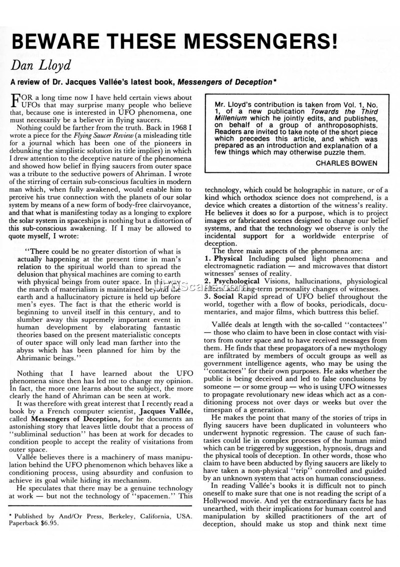 This document contains a critical review of Jacques Vallée's 'Messengers of Deception' and a roundup of contemporary UFO literature. It argues that UFO phenomena may be a tool for psychological manipulation rather than physical extraterrestrial visitation.
