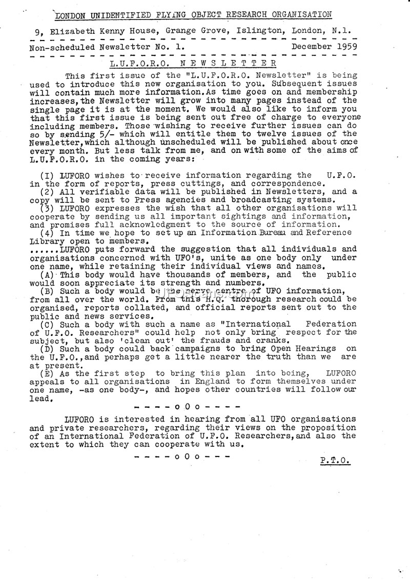 This is the inaugural newsletter of the London Unidentified Flying Object Research Organisation (LUFORO) from December 1959, detailing the group's mission to unify UFO research and reporting on a July 1959 Pacific sighting.
