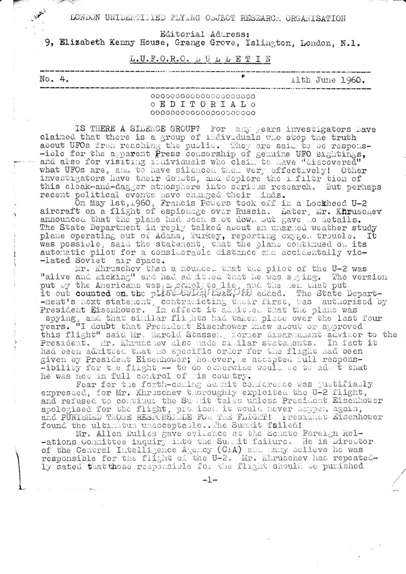 This bulletin from the London Unidentified Flying Object Research Organisation (L.U.F.O.R.O.), dated June 11, 1960, serves as a commentary on both UFO research and contemporary geopolitical events. The editorial opens by questioning the existence of a 'silence group' that allegedly suppresses information regarding UFO sightings and intimidates witnesses. The text draws a parallel between this alleged suppression and the political fallout of the May 1, 1960, U-2 spy plane incident involving Francis Powers. The bulletin discusses the conflicting statements made by the U.S. State Department and Soviet leader Mr. Khrushchev, suggesting that the incident undermined the credibility of the U.S. government and contributed to the failure of the Summit conference. The author posits that the CIA, under Allen Dulles, may have been responsible for the flight and that the agency's influence on President Eisenhower was significant. The document also includes a section titled 'AIR FORCE TREAT UFOs AS SERIOUS BUSINESS,' which highlights new Air Force regulations issued on December 24, 1959, by Major General E.O'Keefe. These regulations, which the bulletin notes were sent to the Senate Space Committee by former CIA director Vice-Admiral R.H. Hillenkoetter, mandate that UFOs be treated as serious USAF business rather than being dismissed as 'flying saucers.' The bulletin further reports on the first public meeting of L.U.F.O.R.O. at Caxton Hall, featuring a talk by Mr. G.F.N. Knewstub of the British Flying Saucer Bureau. Finally, the document includes correspondence regarding a proposed international federation of UFO research groups, with a letter from J.L. Otley of the Tyneside UFO Society advocating for a representative British Council of UFO researchers.
