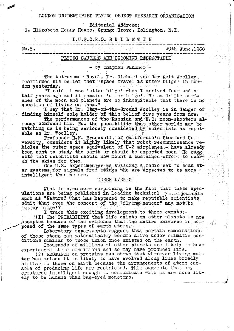 This document is the June 29, 1960, issue (No. 5) of the L.U.F.O.R.O. (London Unidentified Flying Object Research Organisation) Bulletin. The bulletin serves as a compilation of news, scientific commentary, and sighting reports related to Unidentified Aerial Phenomena. The lead article, written by Chapman Pincher, discusses the shifting scientific perspective on the possibility of extraterrestrial life and space travel, contrasting the views of Astronomer Royal Dr. Richard van der Reit Woolley—who famously dismissed space travel as 'utter bilge'—with those of Professor R.N. Bracewell of Stanford University, who suggests the possibility of extraterrestrial robot reconnaissance vehicles. The bulletin argues that the scientific community is increasingly considering the existence of other worlds due to advancements in space-flight and the understanding of universal atomic composition.