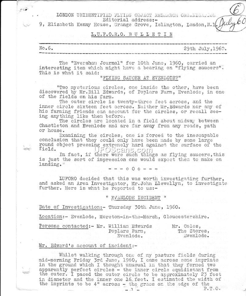 This bulletin documents a 1960 investigation into mysterious ground circles in Evenlode, England, and provides updates on UFO research methodologies and other sighting reports.