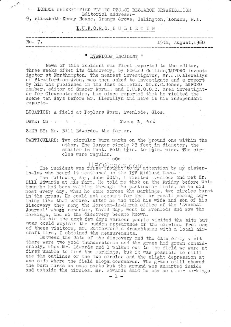 This document is the seventh bulletin issued by the London Unidentified Flying Object Research Organisation (L.U.F.O.R.O.), dated August 15, 1960. The primary focus is the 'Evenlode Incident,' a report of circular burn marks discovered in a field at Poplars Farm, Evenlode, Gloucestershire, on June 3, 1960. The farmer, Mr. Bill Edwards, discovered two concentric circular markings in the grass, with diameters of 23 feet and 15 feet. Investigations were conducted by several L.U.F.O.R.O. members, including Edward Collins, J.D. Llewellyn, and W.S. Farrall. Despite soil and grass samples being sent for laboratory analysis, the results were largely negative, showing no evidence of foreign matter or unusual overheating. The investigator concluded that the markings were not a natural formation and suggested they were caused by an object alighting from the sky, noting the lack of skid marks and the presence of downward pressure. The bulletin also includes reports of other sightings, including a UFO observed by Mr. and Mrs. Kemp in Leigh-on-Sea on June 7, 1960, described as having a bright center and luminous green edges. Additionally, it details a 'mystery fireball' reported in Cardiff, described by witnesses as a brilliant ball of fire with bits falling off, which was investigated by the Royal Air Force at St. Athan, who reported no missing aircraft. The bulletin concludes with administrative notes regarding subscriptions for the publication 'Flying Saucers' by Ray Palmer and a teaser for an upcoming article on 'radar angels' based on findings from the Marconi Wireless Telegraph Company.