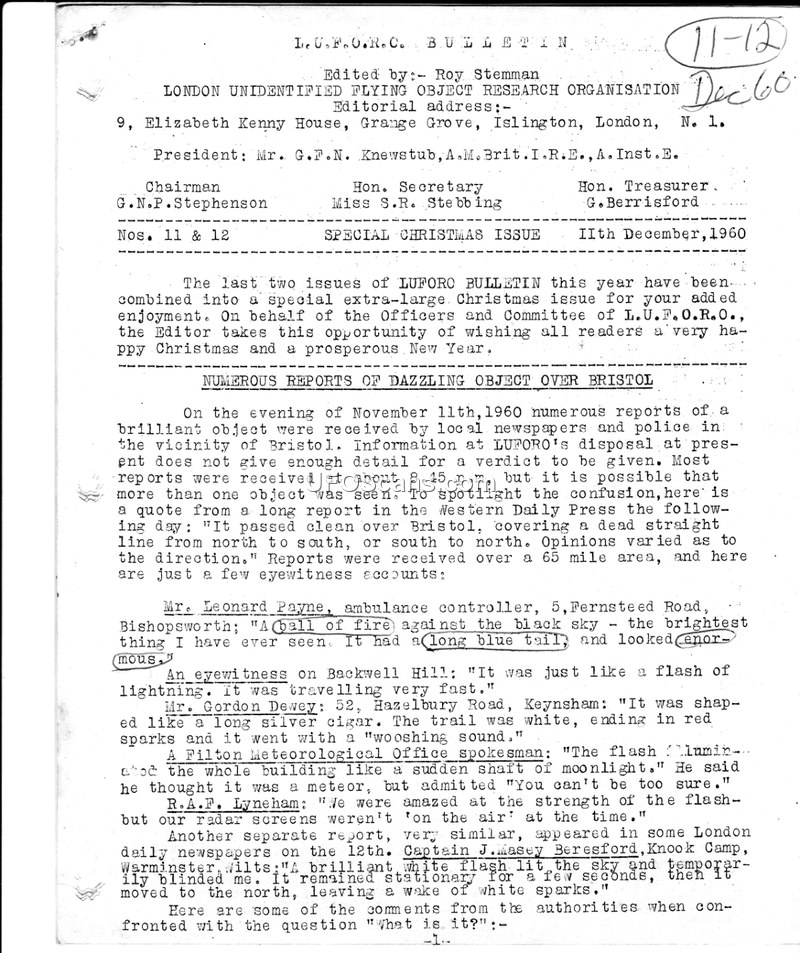 This document is the special Christmas issue of the L.U.F.O.R.C. Bulletin, dated December 11, 1960, published by the London Unidentified Flying Object Research Organisation. The bulletin serves as a compilation of reports, news, and commentary regarding UFO sightings in the United Kingdom and internationally. The primary focus is a series of reports concerning a brilliant object seen over Bristol on November 11, 1960, which generated numerous eyewitness accounts and conflicting official explanations, ranging from meteorites to jet aircraft. The bulletin also covers other incidents, including a sighting in Preston where thousands of football fans observed a hovering object, and a glowing object reported over Coventry. The editor, Roy Stemman, provides commentary on the potential for misinterpretation of natural phenomena as hostile threats, referencing reports of nuclear war scares caused by radar reflections of the moon. The document includes sections on international UFO news, such as a large yellow disc filmed over Sault Ste. Marie, Canada, and the 'Red Bluff' case in California, where police officers reported a UFO that was later dismissed by the U.S. Air Force as a refraction of stars. The bulletin also discusses the activities of various UFO research groups, the publication of books on the subject, and the ongoing efforts of L.U.F.O.R.O. to collect and authenticate sighting reports. It concludes with an appeal for readers to report sightings and a note regarding the transition of the editorship to Mr. Lawrence G. Moore.