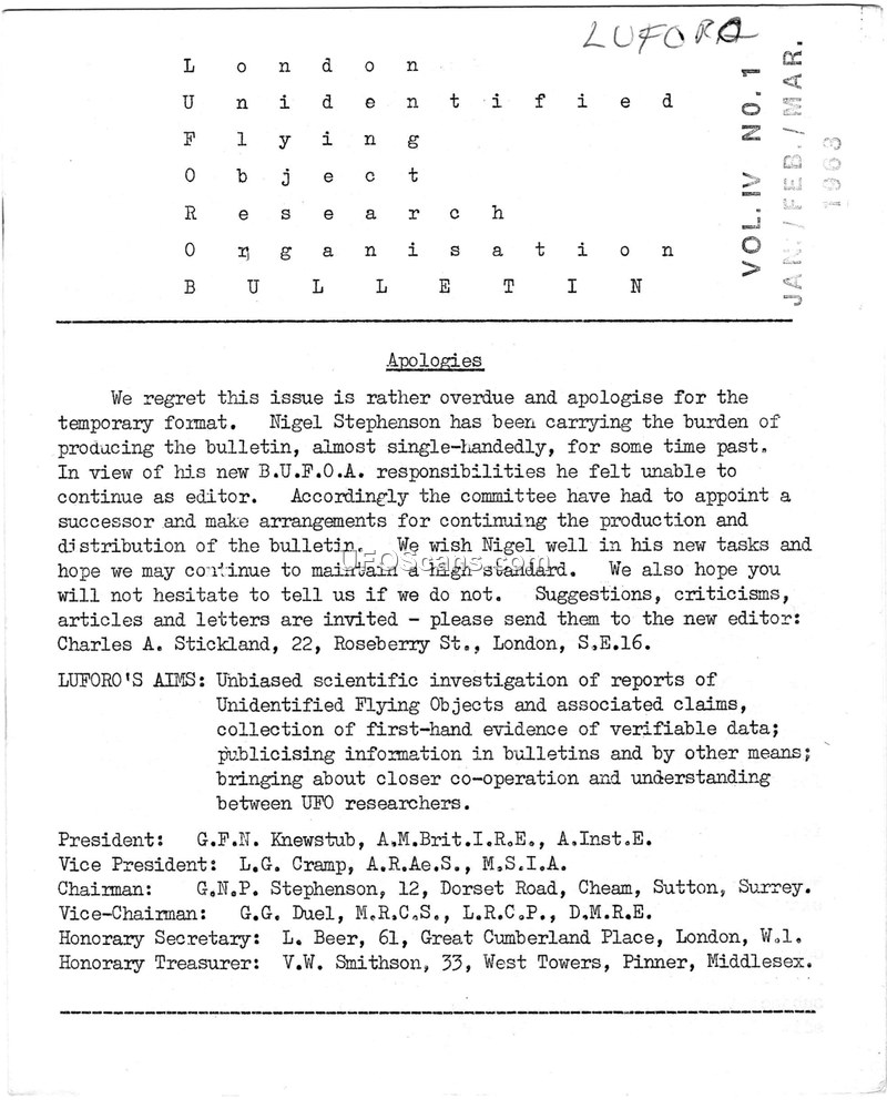 This document is the January/February/March 1963 issue of the London Unidentified Flying Object Research Organisation (LUFORO) bulletin. The editorial addresses the transition of the bulletin's editorship from Nigel Stephenson to Charles A. Stickland. The editorial emphasizes the need for a scientific, balanced approach to UFO reports, advocating for rigorous investigation rather than hasty dismissal or credulity. It poses two questions to readers regarding what information would convince them of an extra-terrestrial origin for a reported object, or the contrary. The bulletin includes an article by Alan Watts discussing the possibility of life on Mars, citing research from the Union Carbide Research Institute regarding the survival of plants and insects in low-oxygen, high-argon atmospheres. Another article by Eric Smith, titled 'UFO RESEARCH', argues that the subject is not being adequately studied by scientific institutions and suggests that UFOs may be associated with a mature technological race. The bulletin also lists several undated newspaper clippings of sightings, including a report from the George H. Fisher family in Sylmar, an observation by the Rev. Cedric Wright near Stafford, and a sighting by a Mr. Allen in Culston Bassett. It provides information on upcoming meetings for the British U.F.O. Association and the Anglo-Polish U.F.O. Research Club, and mentions the availability of photographs of a sighting by Alex Birch in Sheffield.