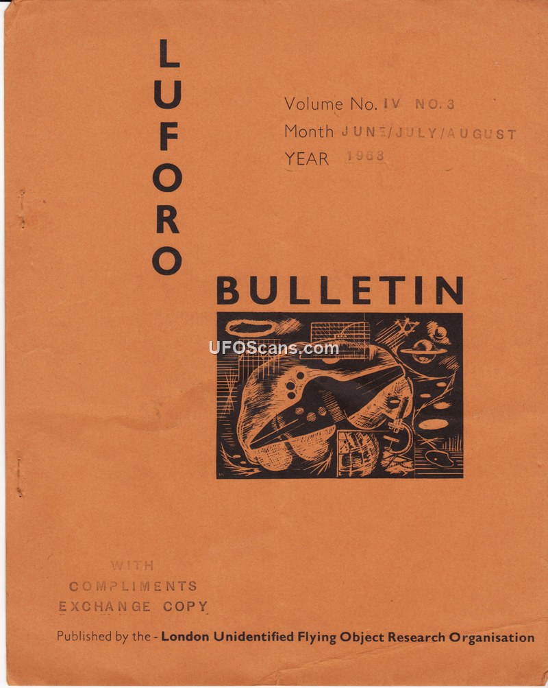 This bulletin, published by the London Unidentified Flying Object Research Organisation (LUFORO), provides a detailed account of a potential UFO landing incident at Charlton, Wiltshire, in July 1963. The report centers on a series of ground markings and crop disturbances discovered at Llanoth Farm, owned by Mr. Rog Blanchard. Witnesses reported seeing a luminous, red, star-like object moving erratically across the sky on the night of July 13, 1963. The object was observed by multiple individuals, including a family traveling by car, who noted that the object appeared to change direction and move in a non-standard flight pattern. Subsequent investigations by LUFORO members, including the editor C. A. Stickland, revealed specific physical evidence at the site, including a central hole and gaps in the barley and potato crops. A bomb disposal unit, which had been called to the site, noted that their detectors were affected by an unknown source, later identified by the British Museum as an iron pan, though this was deemed insufficient to explain the crop damage. The bulletin explores several hypotheses, including a hoax, an explosion, a meteorite, or a genuine UFO landing. The author argues against the hoax and explosion theories, noting the lack of scorch marks and the peculiar nature of the crop removal. Drawing parallels to similar incidents in France and Brazil, the author suggests that the phenomenon may have been caused by a machine utilizing a form of gravitational propulsion. The document also includes a comprehensive list of other UFO sightings reported globally during early 1963, emphasizing the organization's commitment to collecting first-hand, verifiable data. The bulletin concludes with a call for members to assist in future investigations, highlighting the need for prompt notification, standardized equipment, and expert analysis of gathered materials. The publication serves as both a report on the Charlton incident and a call to action for the UFO research community to improve their investigative methodologies.