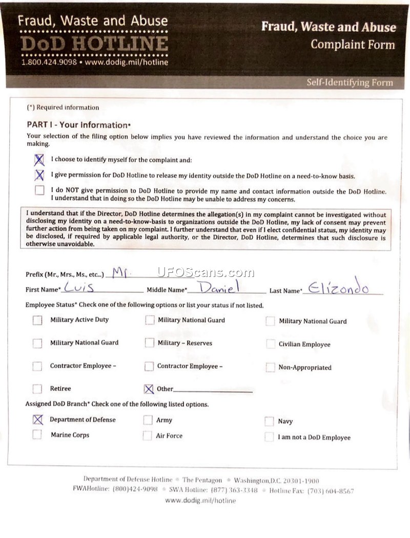 Luis D. Elizondo filed a formal complaint with the DoD Inspector General alleging whistleblower reprisal and disinformation regarding his leadership of the AATIP program. The document provides extensive evidence, including internal correspondence and congressional support, to refute official Pentagon claims that he had no role in the program.