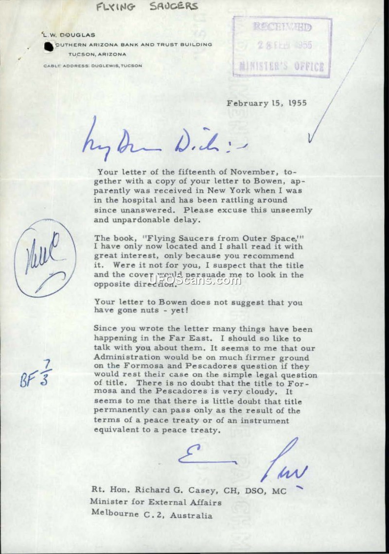 This collection of documents comprises correspondence between the Australian Minister for External Affairs, R.G. Casey, and various diplomatic and scientific figures between 1954 and 1955 regarding the phenomenon of 'flying saucers.' The documents reveal a concerted effort by the Australian government to determine if other nations were taking the subject seriously. Minister Casey solicited reports from Australian diplomatic posts in London, Paris, Rome, New Delhi, and Tokyo, as well as from the United States. The responses from these posts indicate that while there was significant public interest and press coverage—particularly in France and Italy—official government and scientific circles generally viewed the reports with skepticism.