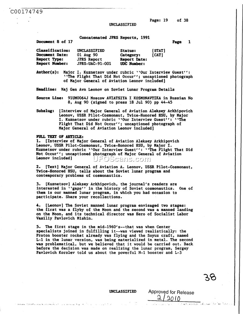 This document contains a 1990 interview with Soviet cosmonaut Aleksey Leonov regarding the history of the Soviet lunar program and its cancellation. Leonov explicitly dismisses claims of extraterrestrial sightings by astronauts as misinterpretations of radio communications.