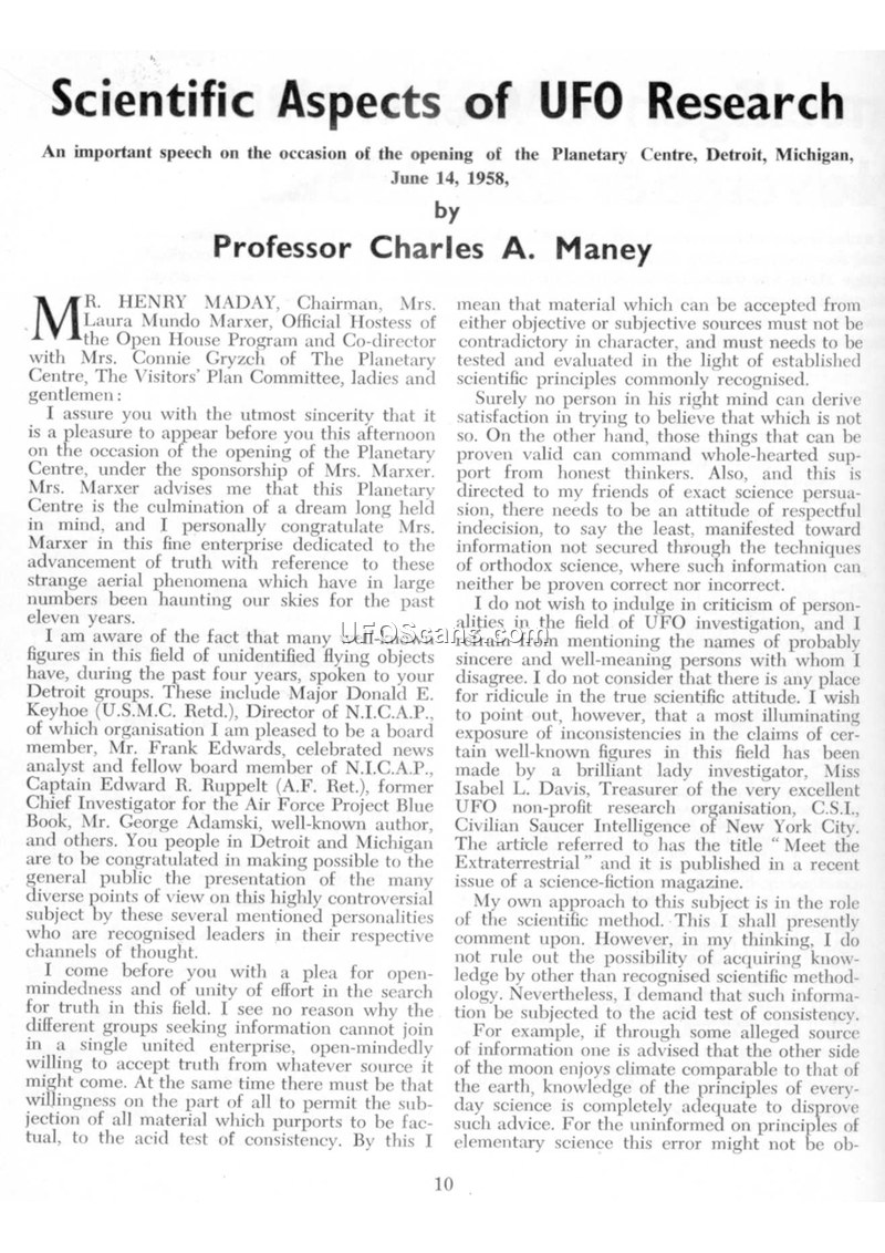 This document is a transcript of a speech delivered by Professor Charles A. Maney on June 14, 1958, at the opening of the Planetary Centre in Detroit, Michigan. Professor Maney addresses the necessity of applying rigorous scientific methods to the study of unidentified aerial phenomena. He emphasizes the importance of open-mindedness, consistency, and the evaluation of evidence through established scientific principles. Maney discusses the challenges of verifying reports, noting that while some claims may be fraudulent, others warrant serious investigation. He highlights the work of organizations like N.I.C.A.P. and mentions several prominent figures in the field, including Major Donald E. Keyhoe and Captain Edward R. Ruppelt. A significant portion of the speech is dedicated to the 'Trinidad UFO Incident' of January 16, 1958, in Brazil. Maney describes how the Brazilian Navy, while conducting I.G.Y. research, observed and photographed a UFO near Trinidad Island. He details the account of Captain Teobaldo Viegas and photographer Almiro Barauna, noting that the incident received official recognition from the Brazilian government and President Juscelino Kubitschek de Oliveira. Maney compares the description of the Trinidad object—two superimposed saucers joined by a ring—to photographs taken by Warrant Officer Delbert C. Newhouse in 1952. The speech concludes by reinforcing the idea that the repetition of similar UFO phenomena under specific conditions provides a basis for scientific study and the accumulation of knowledge in the field.