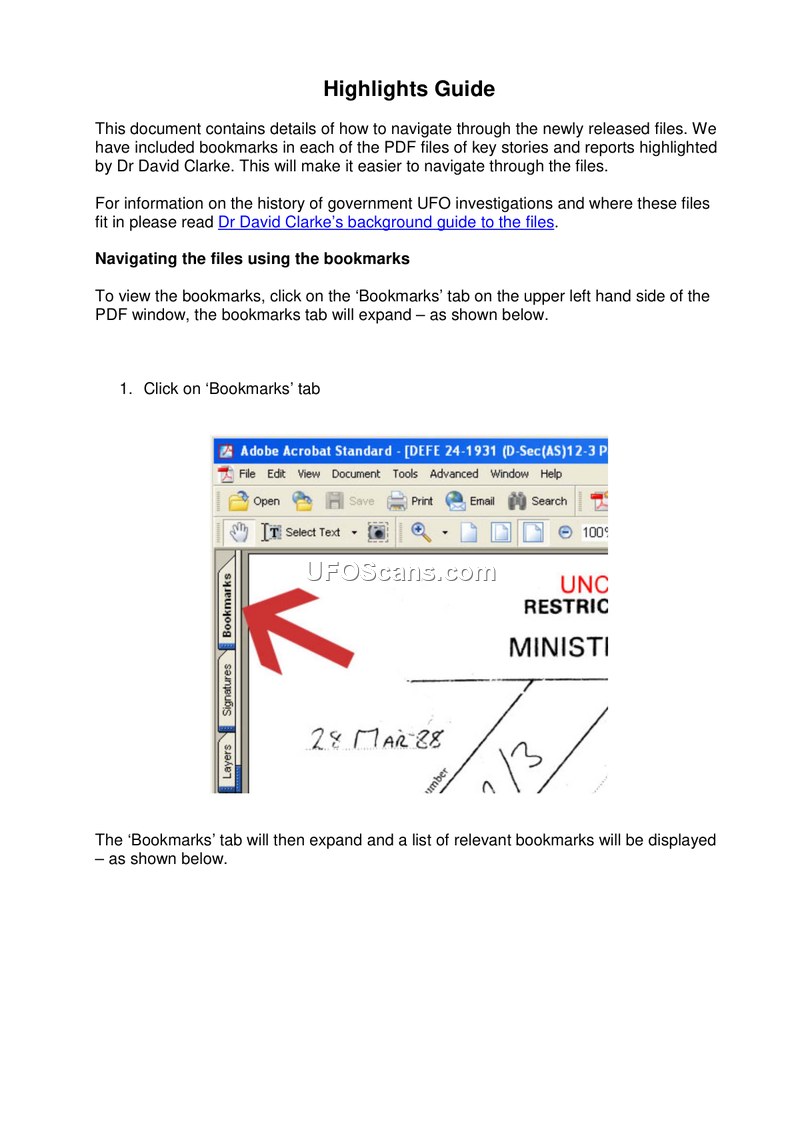 This document serves as a navigational guide for a tranche of declassified files released by the Ministry of Defence (MoD) regarding Unidentified Aerial Phenomena (UAP) and UFO investigations. The guide provides instructions on how to use PDF bookmarks to locate key stories and reports identified by Dr. David Clarke. It categorizes the files into several thematic areas, including files released under the Freedom of Information Act, Parliamentary interest in UFOs, government policy, specific sightings, and geographical reports. The document outlines the history of MoD UFO investigations, noting that the workload of the UFO desk increased significantly during the 1990s, particularly around the 50th anniversary of the Roswell incident. It details the creation of 'Project Condign,' a Defence Intelligence study completed in 2000, which concluded that UFOs posed no threat to the UK. The guide also highlights various specific incidents, such as the 1967 student 'flying saucer' hoax, the 1979 Yorkshire TV debate, and the 1996-97 'Alien Autopsy' film discussions. It addresses government concerns regarding space debris, including the potential hazards posed by the re-entry of the Skylab space station, and notes the destruction of certain Defence Intelligence files from 1980-82, including those related to the Rendlesham Forest incident. The document provides a comprehensive index of file references (DEFE 24 series) categorized by geographical location, allowing researchers to locate reports from specific regions across the UK and abroad, such as Sri Lanka and the Netherlands. The guide emphasizes that the provided list is not comprehensive but highlights incidents of particular interest or those containing detailed descriptions.