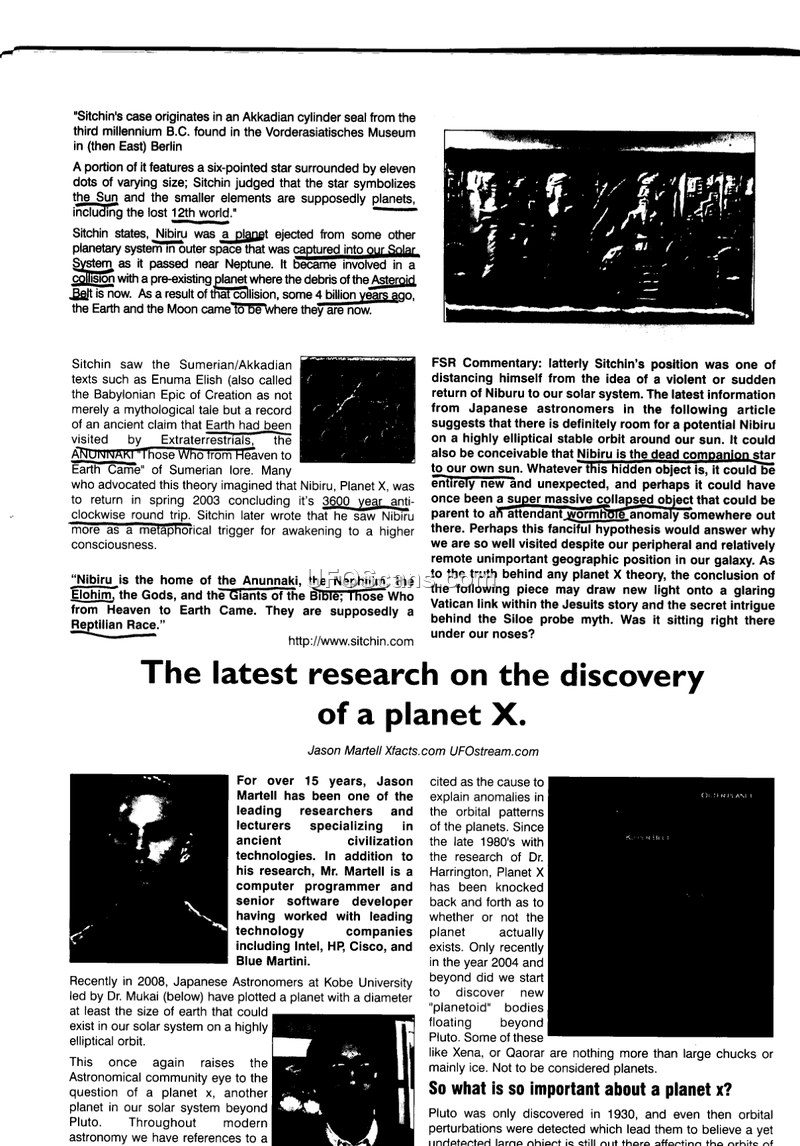 This document is a compilation of articles and commentary regarding the existence of 'Planet X' and its historical and theological implications. It begins by detailing Sitchin's theories, which suggest that Planet X (Nibiru) was a planet captured by our solar system, leading to a collision that formed the Earth and Moon. Sitchin claims that the Anunnaki, the Elohim, and the Giants of the Bible are associated with this planet. The text transitions to modern astronomical efforts to locate a planet beyond Pluto, mentioning research by Dr. Mukai at Kobe University and the use of the SIRTF (Spitzer) telescope by John Carr and Joan Najita. The document also explores the 'Nemesis' theory, which posits that a binary companion to our sun may have caused mass extinctions on Earth. A significant portion of the text is dedicated to the Vatican Observatory, specifically the views of Rev. Jose Gabriel Funes, who discusses the possibility of extraterrestrial life in the context of faith. Finally, the document includes a letter from Salvador Freixedo, a former Jesuit, who shares his perspective on the UFO phenomenon, suggesting that intelligent extra-human beings may be manipulating humanity.