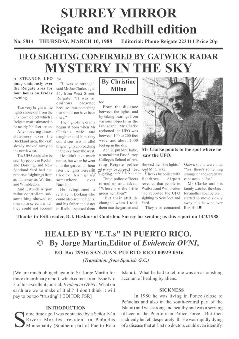 This document is a compilation of reports from the Surrey Mirror (March 10, 1988) and the Flying Saucer Review (FSR). The first section details a UFO sighting in Buckland, Surrey, on March 4, 1988. Witness Joe Clarke reported a large, egg-shaped object with two bright white lights hovering at approximately 2,000 feet for four hours. The object was reportedly tracked by Gatwick Airport radar, which could not identify the source. The second, more extensive section is a translated report by Jorge Martín regarding an alleged abduction and healing of Iván Rivera Morales in Puerto Rico. Morales, a former police officer, claimed that in 1980, while suffering from a terminal rheumatic disease, he was visited by 'balls of golden light' and subsequently abducted by extraterrestrial beings. He described being taken to an underwater base, examined by grey-skinned beings, and subjected to a 'mental scan.' Morales claimed that following this experience, his terminal condition vanished, and he made a miraculous recovery. The document also includes editorial commentary from FSR regarding the phenomenon of 'UFO healings,' referencing other researchers such as Thomas E. Bullard, David Jacobs, and John F. Schuessler. The editor discusses the theological and cultural implications of these entities, comparing them to angels or Jinn, and emphasizes the need for objective investigation into these claims.