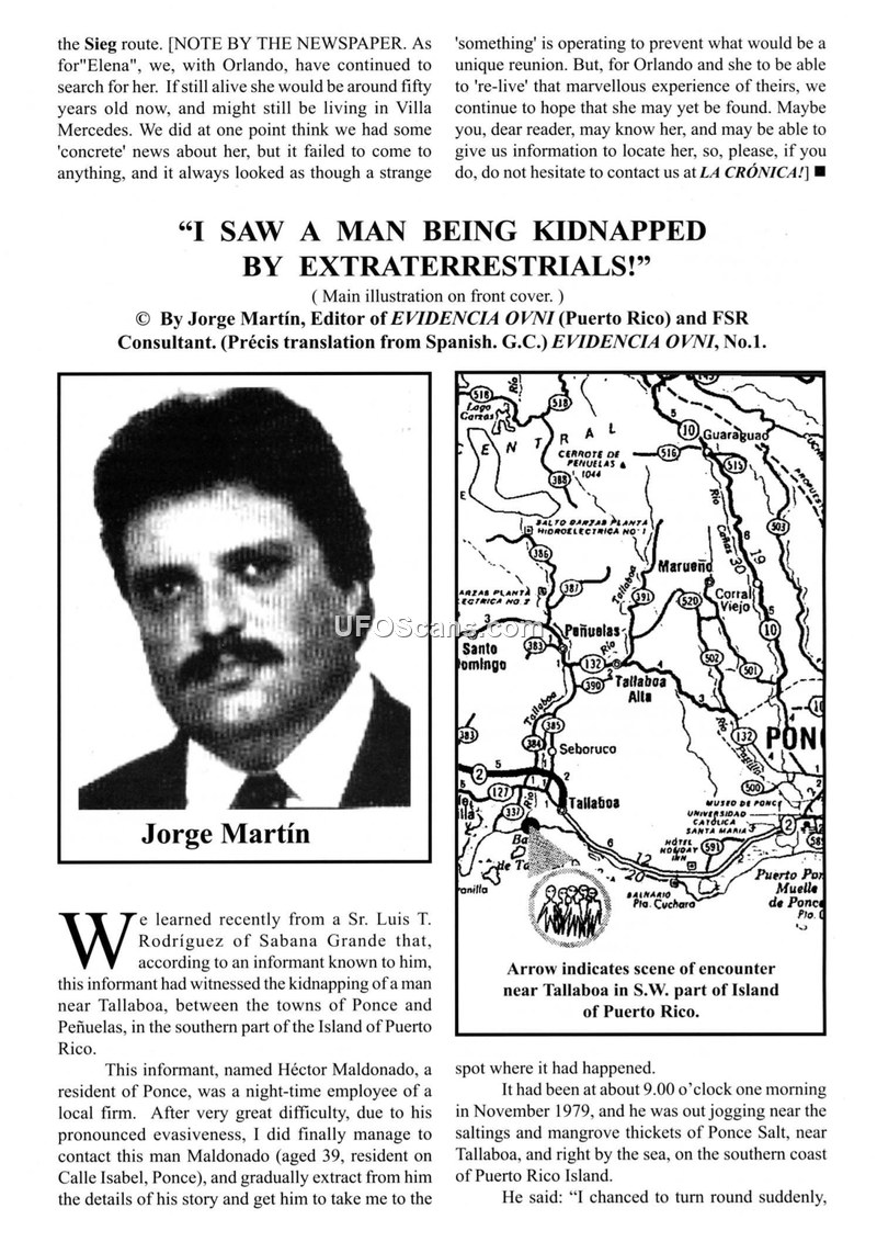 This document is a compilation of reports and commentary regarding UFO sightings and alleged alien abductions in Puerto Rico, authored by Jorge Martín, editor of EVIDENCIA OVNI. The primary account details the experience of Héctor Maldonado, a resident of Ponce, who claims to have witnessed the abduction of a man by extraterrestrial beings near Tallaboa in November 1979. Maldonado describes the beings as having greyish-blue skin, large almond-shaped eyes, and pointed teeth. He also reports finding a 100-foot circular depression in the soil at the site years later. The document further chronicles other incidents, including the 1989 experience of Juan Batista in Arecibo, who encountered beings that communicated telepathically, and reports of beings being chased by dogs in Corozo de Cabo. Additionally, the text discusses a 1988 sighting of a large, illuminated triangle near Sierra Bermeja, which was allegedly observed by multiple witnesses, including Carlos Manuel Mercado. The author argues that these events are part of a larger, persistent pattern of UFO activity in Puerto Rico, characterized by abductions, physical traces, and military involvement, and suggests that government authorities are actively concealing information about these phenomena. The document also includes advertisements for other UFO-related publications, such as the 'Hill-Norton Initiative' report and 'The Humanoids'.