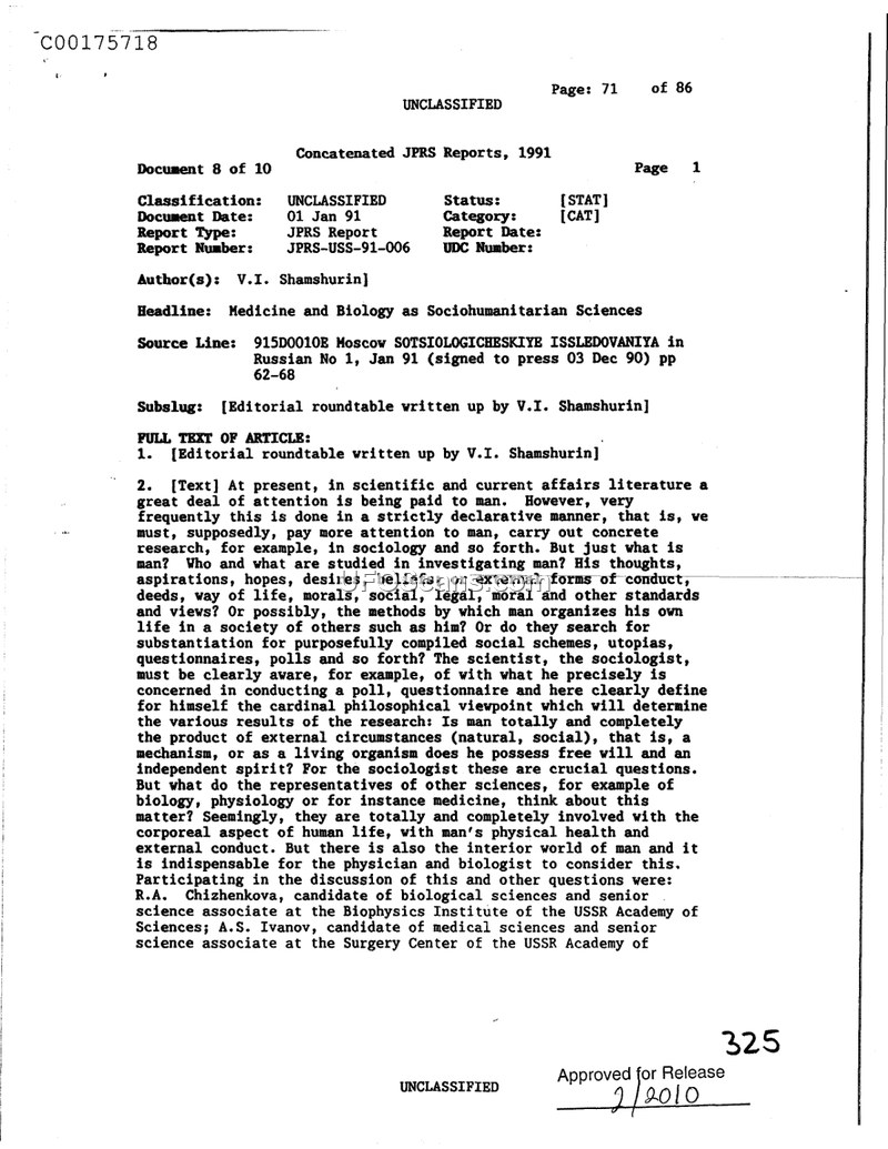 This document is a transcript of an editorial roundtable discussion published in the January 1991 issue of the Soviet journal 'Sotsiologicheskiye Issledovaniya'. The session, chaired by V.I. Shamshurin, brought together a panel of experts including biologists, medical doctors, and philosophers to discuss the necessity of integrating sociohumanitarian sciences with biology and medicine. The participants argue that modern scientific research often treats man as a mechanism or a biological entity, ignoring the 'interior world' and the social context of human existence. The discussion explores several themes, including the role of social institutions in human health, the limitations of purely biological approaches to human behavior, and the need for interdisciplinary cooperation. A significant portion of the dialogue addresses the rise of parapsychology and 'miracles' in the public consciousness, which the participants view as a symptom of societal crisis. They discuss the activities of figures like Uri Geller and the skepticism of critics like J. Randy, using these examples to debate the boundaries between scientific inquiry and pseudoscience. The panel also touches upon the anthropic principle in cosmology, the impact of environmental pollution on human health, and the ethical responsibilities of physicians and scientists. The overarching conclusion of the roundtable is that a holistic approach, combining social analysis with natural science, is essential for understanding human development and ensuring the survival of society under modern conditions.
