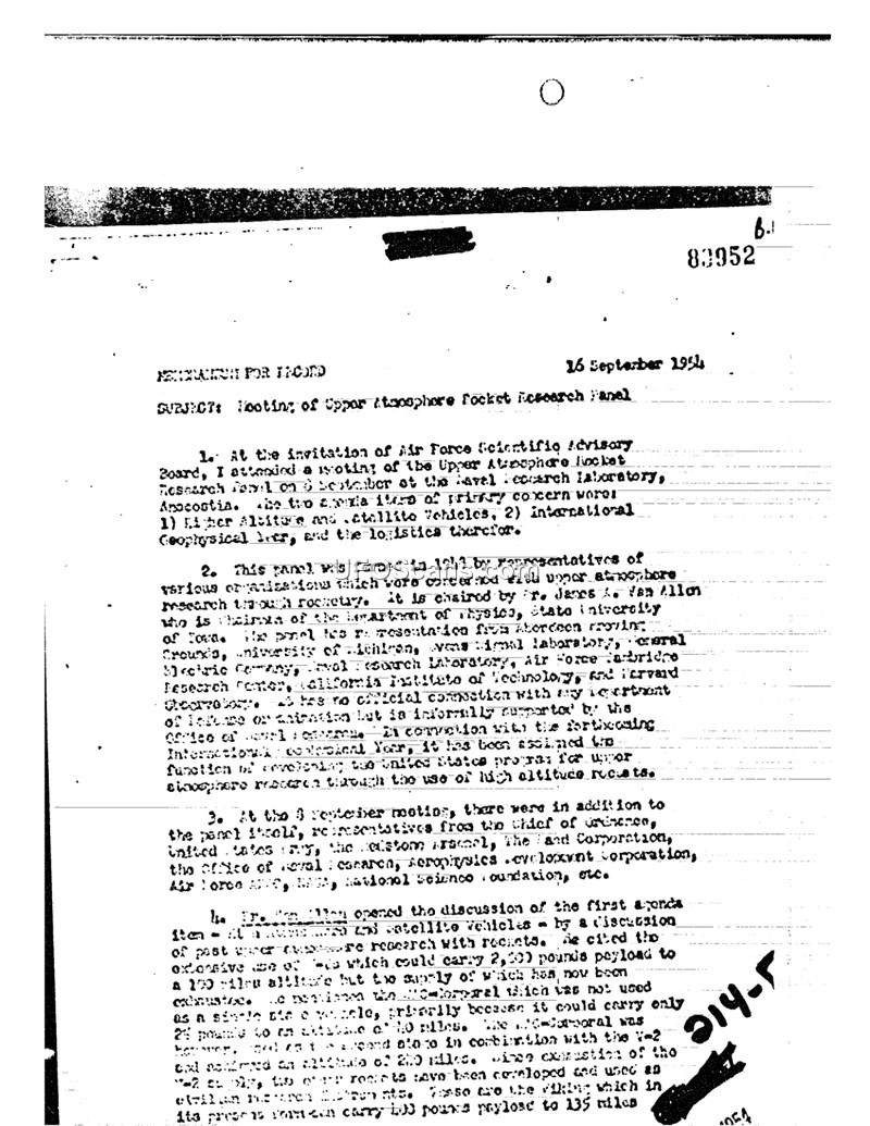 This memorandum for the record, dated September 16, 1954, documents a meeting of the Upper Atmosphere Rocket Research Panel held at the Naval Research Laboratory in Anacostia. The panel, chaired by Dr. James A. Van Allen, was established in 1946 to coordinate upper atmosphere research. The meeting focused on two primary areas: high-altitude and satellite vehicles, and the logistics associated with them. The document outlines the history of the panel, noting its informal support by the Office of Naval Research and its collaboration with various academic and military institutions, including the University of Michigan, the Air Force Cambridge Research Center, and the National Science Foundation. A significant portion of the discussion centered on the development of satellite vehicles (ISV). Dr. Van Allen presented a three-phase plan for the ISV: first, the placement of an uninstrumented observable object in orbit; second, the placement of an instrumented vehicle; and third, the placement of a manned satellite vehicle. The panel discussed the technical challenges of these phases, including the development of reliable power plants, weight reduction, and the necessity of precise orbital orientation. Specific rocket systems were reviewed, including the Viking, which could carry payloads to 135 miles, and the Aerobee, which could reach 60 miles. The panel also discussed the Redstone missile and the Loki booster system. The author, P. G. Stare, reflects on the meeting, highlighting the challenges of obtaining scientific data from rockets and the success of a specific fuse design. The document underscores the high-level coordination between the U.S. military and civilian scientific community to advance rocket technology and satellite capabilities during the early Cold War period.