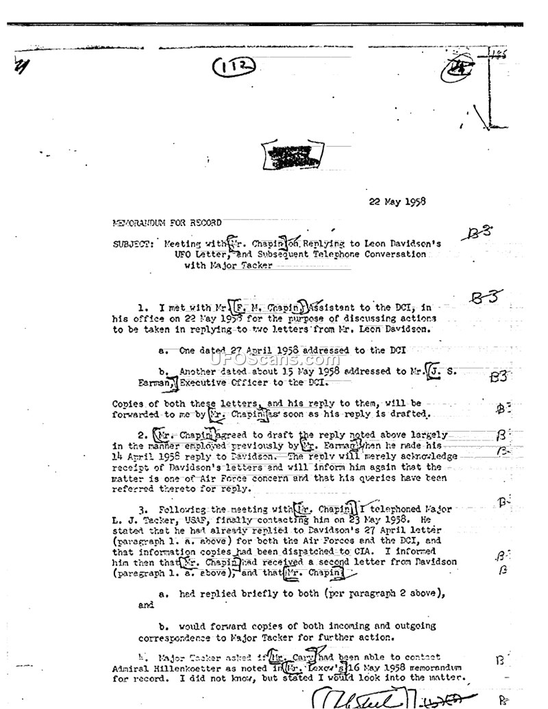 This memorandum for the record, dated 22 May 1958, documents a meeting between the author, LaRae L. Teel of the Scientific Intelligence division, and Mr. F. M. Chapin, Assistant to the Director of Central Intelligence (DCI). The purpose of the meeting was to coordinate a response to two letters received from Leon Davidson regarding UFOs. One letter was addressed to the DCI, and the other to Mr. J. S. Earman, the Executive Officer to the DCI. It was agreed that the response would follow the precedent set by Mr. Earman in a previous reply to Davidson, which was to acknowledge receipt of the letters and inform the sender that the subject is an Air Force matter, and that his queries had been referred to them. Following the meeting, the author contacted Major L. J. Tacker of the USAF on 23 May 1958. Major Tacker confirmed he had already replied to Davidson's 27 April letter on behalf of both the Air Force and the CIA. The author informed Tacker that a second letter from Davidson had been received and that Mr. Chapin would provide a brief reply and forward the correspondence to Tacker for further action. The document also notes a query from Major Tacker regarding whether a Mr. Cary had successfully contacted Admiral Hillenkoetter, as referenced in a 16 May 1958 memorandum.