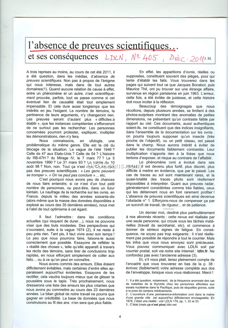 This article, published in the December 2011 issue of LDLN (No. 405), discusses the persistent lack of scientific evidence regarding Unidentified Aerial Phenomena (UAP/UFOs) and the consequences this has for the field of ufology. The author, identified as J.M., reflects on the state of research in France over the previous 35 years, noting that despite a large volume of available data, the core problem of proving the existence of these phenomena remains unsolved. The text highlights that media and public interest often focus on the absence of proof, which creates a cycle of frustration. The author cites specific historical examples, such as the June 1963 sighting involving Jacques Bonabot and Maurice Thil, to illustrate how historical cases are often fraught with errors that require careful rectification. A significant portion of the text addresses the quality of evidence collected by the organization. The author notes that many photographs submitted are of little scientific value, often showing small, insignificant anomalies. Furthermore, the author addresses the difficulty of interpreting physical traces, which have become increasingly rare and difficult to analyze. Radar data is also mentioned as being generally unreliable. The author concludes by acknowledging the limitations of the current research environment, noting that the magazine is produced by a single individual struggling with administrative burdens. The article serves as a call for greater rigor, patience, and a commitment to sticking to the facts rather than drawing premature conclusions, despite the challenges inherent in the field.