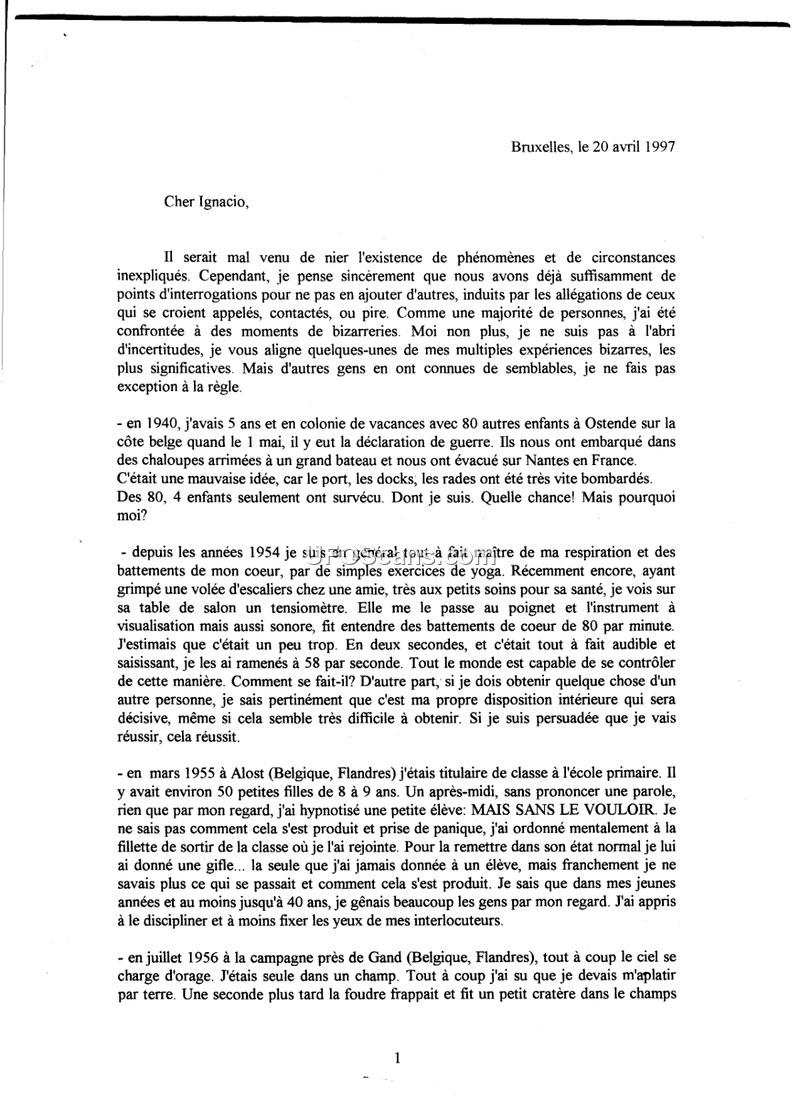 Personal Correspondence Regarding Unexplained Phenomena and Life Experiences — Brussels, April 20, 1997