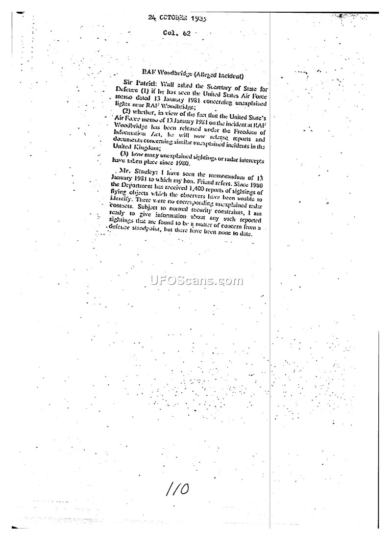 This collection of documents comprises correspondence, parliamentary questions, and internal memoranda from the British Ministry of Defence (MOD) regarding the alleged UFO incident at RAF Woodbridge in December 1980. The primary focus of the documentation is the MOD's response to public and parliamentary inquiries, specifically those prompted by media reports in the 'News of the World' and the subsequent publication of a book titled 'Sky Crash'. The documents detail the official stance of the MOD, which consistently maintained that the reported sightings at RAF Woodbridge held no defence significance. The MOD asserted that there was no evidence of a landing, no contact with extraterrestrial beings, and no unidentified objects detected on radar. Officials frequently cited alternative, rational explanations for the sightings, such as the pulsating light from the Orfordness lighthouse, falling satellite debris, or unusual atmospheric conditions. The correspondence reveals a tension between the public's desire for transparency and the government's policy regarding the release of files, which were subject to the 30-year rule under the Public Records Act. Several letters from MOD officials, including P.J. Titchmarsh and D.H. Moreland, address specific queries from members of the public and Members of Parliament, such as Sir Patrick Wall and Merlyn Rees. These responses emphasize that the MOD's interest in UFO reports is strictly limited to determining if there are implications for the air defence of the United Kingdom. The file also includes a copy of the original report authored by Lt. Col. Charles I. Halt of the USAF, which describes the initial sighting of a glowing, triangular object in the forest near RAF Woodbridge, the discovery of physical depressions in the ground, and radiation readings. Despite the detailed nature of Halt's report, the MOD maintained that their investigations were sufficient to rule out any threat. The documents also reflect the administrative process of handling parliamentary questions (PQs) and the internal coordination between the MOD and the US Air Force to address Freedom of Information requests. Ultimately, the archive serves as a record of the government's efforts to manage public interest in the Rendlesham Forest incident while adhering to established security and administrative protocols.