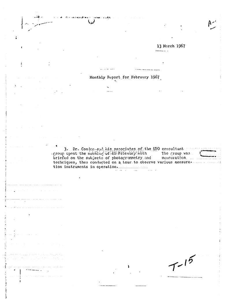 This document is a monthly report dated 13 March 1967, covering activities for February 1967. It details two primary administrative updates regarding the UFO consultant group and the UFO Mensuration Support project. On 20 February 1967, Dr. Condon and his associates from the UFO consultant group participated in a briefing on photogrammetry and mensuration techniques, followed by a tour of operational measurement instruments. Additionally, the report notes that the UFO Mensuration Support project was officially closed. The closure followed an evaluation of photographic prints, which resulted in no definitive conclusion regarding the authenticity of the images in question.