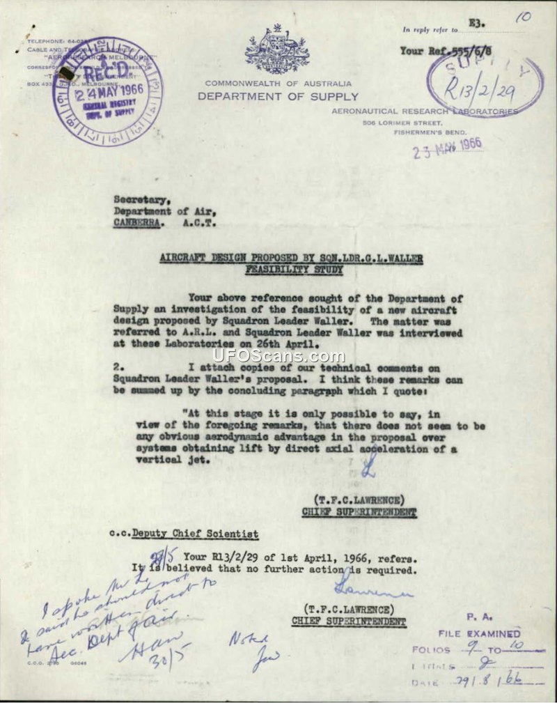This document collection details the administrative and technical evaluation of an aircraft design proposed by Squadron Leader G.L. Waller of the Royal Australian Air Force (RAAF) in early 1966. The proposal, titled 'Aircraft with Annular Aerofoil,' was submitted to the Department of Air and subsequently referred to the Department of Supply for a feasibility study. The design featured a circular body with a central rotating assembly, including a centrifugal fan, an annular aerofoil, and jet reaction devices intended to provide vertical and transitional flight capabilities. Squadron Leader Waller sought to patent the concept and requested an evaluation of the aerodynamic principles involved. The Department of Air, believing the invention might have military significance, requested that the Aeronautical Research Laboratories (ARL) conduct a detailed study. Correspondence between Waller, the Department of Air, and the Department of Supply shows that Waller met with ARL staff to discuss his ideas and provided patent specifications and schematic drawings. ARL conducted a technical review of the proposal, focusing on the aerodynamic properties of the annular aerofoil and the efficiency of the air generator system. Their assessment, dated May 20, 1966, concluded that the data provided was insufficient for a precise study but noted that the design did not appear to offer any obvious aerodynamic advantage over existing vertical lift systems. The Chief Superintendent of ARL, T.F.C. Lawrence, formally advised the Department of Air that no further action was required regarding the proposal. The file includes internal memoranda, letters of correspondence, patent application documents, and technical comments outlining the design's mechanics, such as the use of variable control vanes and the gyroscopic stability provided by the rotating components.
