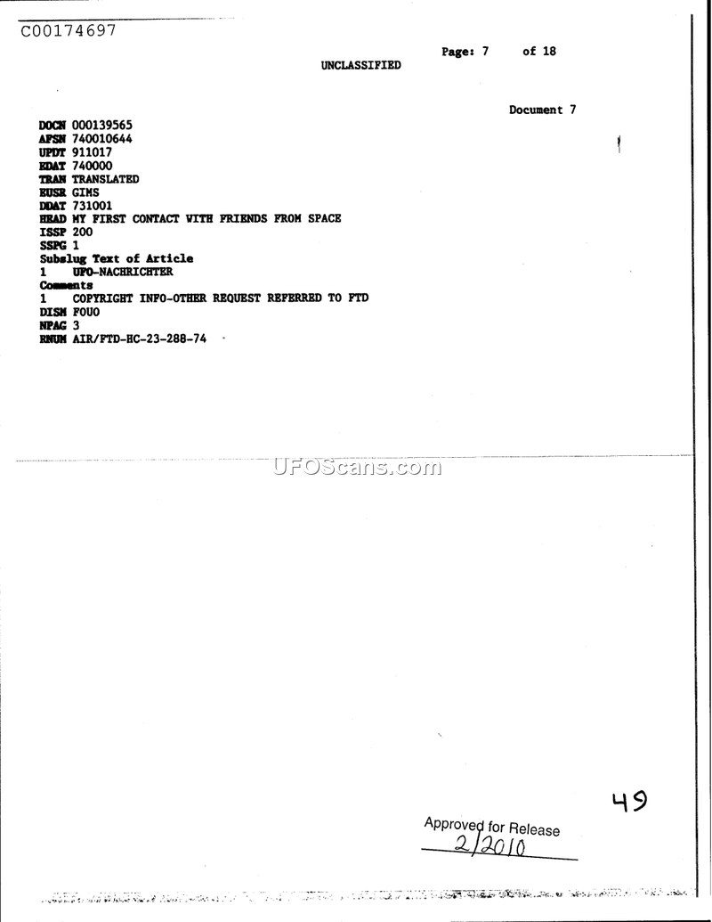 This document is a brief administrative record, identified as document number 000139565, which serves as a reference entry for an article titled 'MY FIRST CONTACT WITH FRIENDS FROM SPACE'. The record indicates that the original text was translated and categorized under the subject 'UFO-NACHRICHTER'. The document notes that copyright information and other requests regarding this material were referred to the FTD (Foreign Technology Division). The record is marked as unclassified and was approved for release in February 2010. It references the control number AIR/FTD-HC-23-288-74.