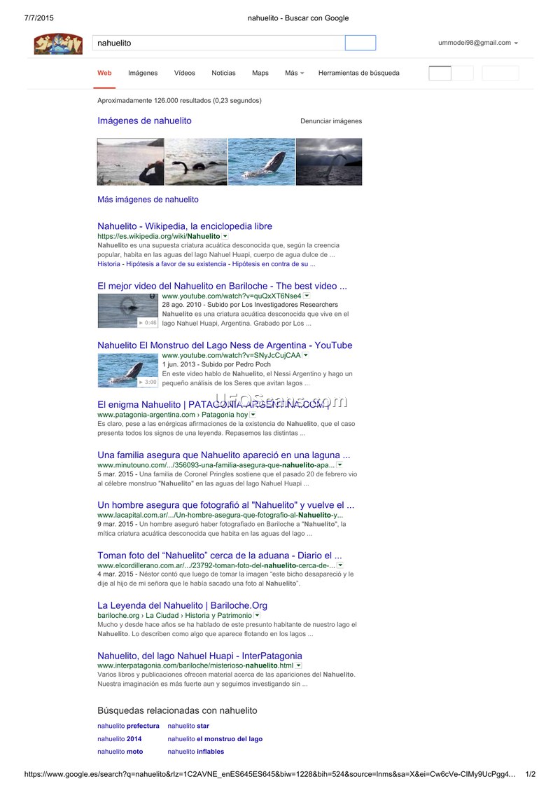 The document is a collection of search results regarding the 'Nahuelito', a legendary aquatic creature said to inhabit Lake Nahuel Huapi in Argentina. The results include references to Wikipedia, YouTube videos, and various news articles from 2015 reporting on alleged sightings and photographs of the creature.
