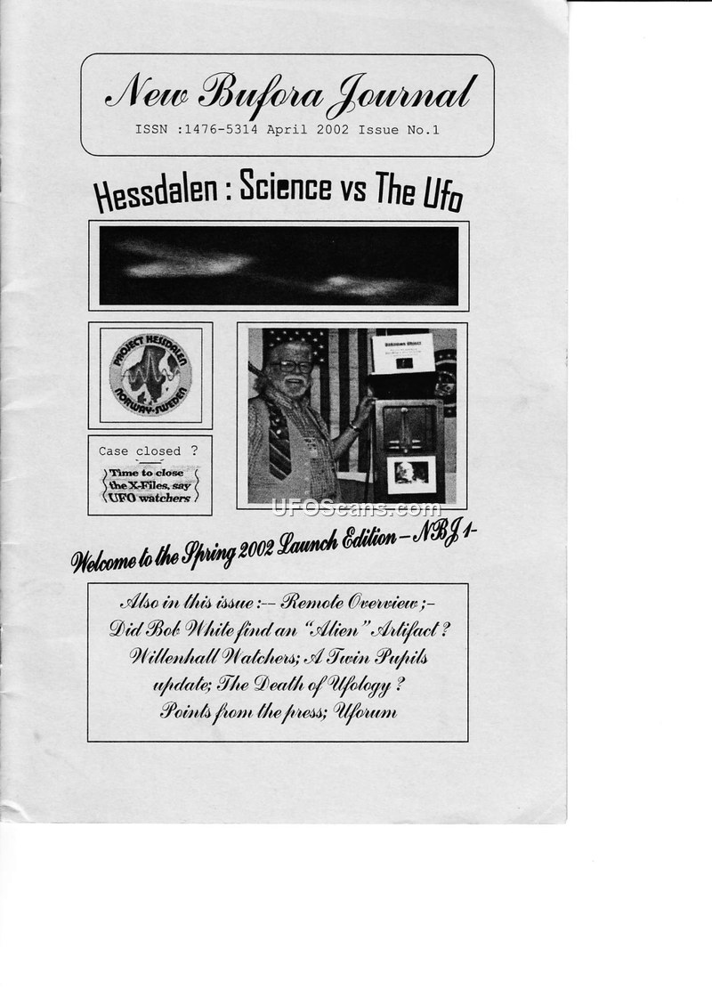 The New Bufora Journal, Issue No. 1, published in April 2002, serves as a launch edition for the British UFO Research Association (BUFORA). The journal provides a comprehensive overview of contemporary ufology, focusing on scientific research, international collaboration, and the intersection of UFO phenomena with psychic (PSI) experiences. A significant portion of the journal is dedicated to 'Project Hessdalen,' a long-term scientific study of mysterious lights in the Hessdalen valley of central Norway. The project, initiated in the early 1980s by independent researchers, utilized sophisticated instrumentation including radar, cameras, spectrum analyzers, and magnetometers to investigate the lights. The journal includes an interview with Odd-Gunnar Roed, a project coordinator, who discusses the challenges of the study and the inconclusive nature of the findings, noting that while the lights are 'real,' their origin remains unidentified. The journal also features a report on 'Bob White's' encounter with a potential 'alien artifact' in Colorado, which he later displayed at his 'Museum of the Unexplained' in Missouri. The publication includes an editorial by Norman Oliver, who reflects on the history of BUFORA and the challenges of maintaining scientific rigor in the field. Other sections cover 'Willenhall Watchers,' a personal sighting account; a 'Remote Overview' by Steve Gamble regarding remote viewing techniques; and a feature on the 'Evora' case in Portugal, which involved the discovery of an unknown organism associated with 'Angel Hair' or 'Fibralvina.' The journal also includes book reviews, a 'Uforum' section featuring correspondence from Denis Plunkett of the British Flying Saucer Bureau regarding media misrepresentation, and a personal account of the 'Unconvention 2002' conference by Lionel Beer. The journal emphasizes the need for continued, unbiased scientific research and the importance of maintaining an open mind regarding the UFO enigma, while acknowledging the high percentage of explainable sightings.