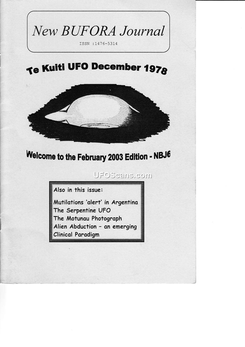 This document is the February 2003 edition of the New BUFORA Journal (Issue No. 6), published by the British UFO Research Association. The journal serves as a compilation of reports, editorial commentary, and articles concerning Ufology, alien abduction, and related paranormal topics. The editorial by Norman Oliver addresses the 'hypnosis debate,' noting BUFORA's official position against the use of regressive hypnosis in investigations, while acknowledging that some members find it useful. The issue features an extensive excerpt from an article by Catherine Austin Fitts regarding the 'Black Budget' and its potential connection to alien technology and disinformation campaigns. A significant portion of the journal is dedicated to the 'Bad Holiday' report, a detailed account of a 1982 sighting on the A1 in Yorkshire by a witness who experienced a sense of unreality, or 'Oz factor,' during a close encounter with a craft. The journal also includes reports on cattle mutilations in Argentina, the 'Serpentine UFO' photograph from 1971, and the 'Motunau Photograph' from 1979. Further sections cover the Raelians and their cloning claims, Stalin's alleged interest in UFOs, and a 'hypnotherapy masterclass' by Dr. Bruce Fox, which explores the clinical paradigm of alien abduction. The journal concludes with a book review of 'Without Consent' by Carl Nagaitis and Philip Mantle, and an announcement of upcoming BUFORA lectures for 2003, covering topics such as the 'Montauk and Philadelphia Experiment' and the 'Merseyside UFO Project.' The publication maintains a stance of open-minded skepticism, emphasizing the need for scientific, sensible, and logical investigation while acknowledging the complexity of the phenomena.