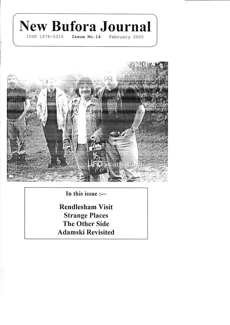 The New Bufora Journal, Issue No. 14 (February 2005), serves as a publication for the British UFO Research Association (BUFORA). The journal contains a mix of editorial commentary, investigative reports, and historical analysis regarding UFO and paranormal phenomena. Editor Steve Gamble opens the issue by discussing the methodology of UFO investigation, arguing that the strength of evidence lies in the cumulative weight of multiple cases rather than individual 'best cases.' He emphasizes the importance of reproducibility and revisiting old cases with new evidence.