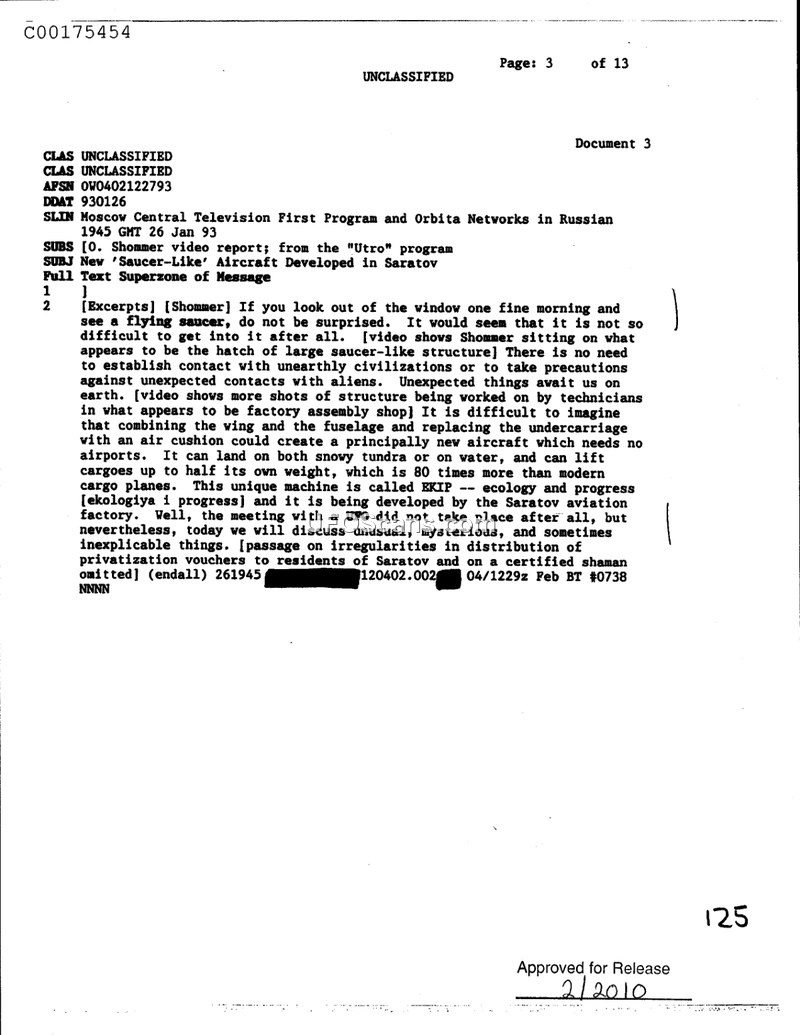 A 1993 Russian television broadcast identifies a 'saucer-like' aircraft as the EKIP, an experimental vehicle developed in Saratov. The aircraft is designed to operate without airports using an air cushion system.