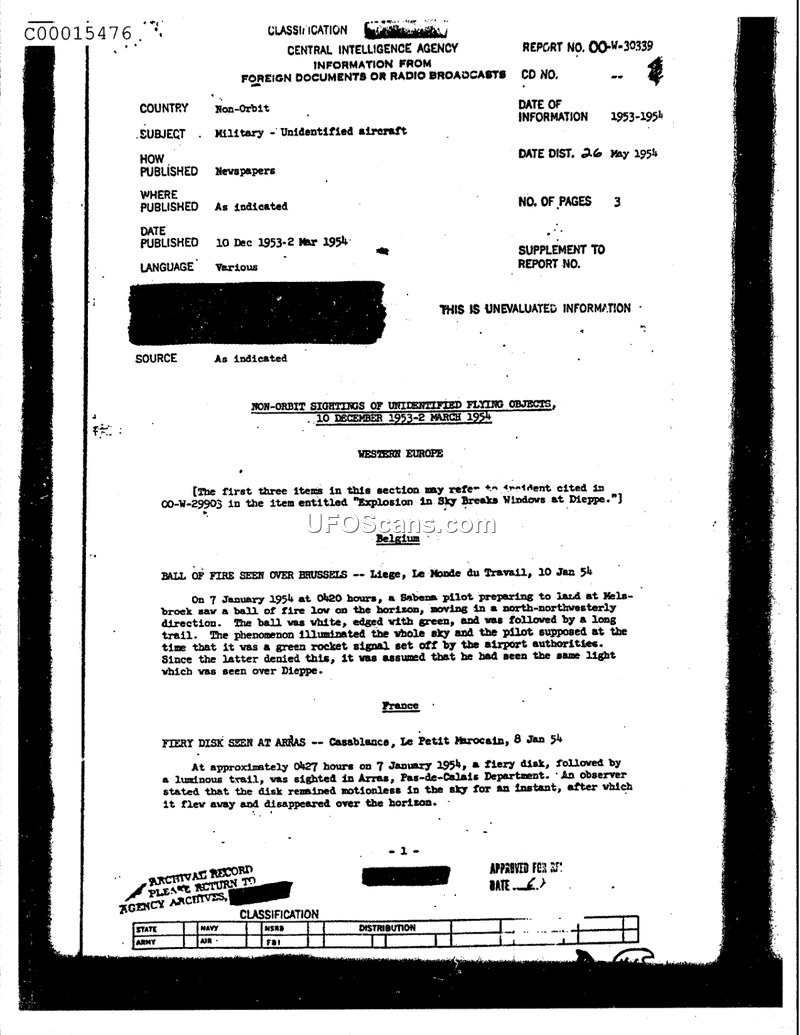 This Central Intelligence Agency report, dated 26 May 1954, compiles a series of sightings of unidentified flying objects reported between 10 December 1953 and 2 March 1954 across Western Europe, the Near East, Africa, and Latin America. The document serves as a summary of press reports regarding these phenomena. In Western Europe, incidents include a ball of fire seen over Brussels on 7 January 1954, a fiery disk sighted in Arras, France, on the same day, a 'flying saucer' identified as a meteorite over Dieppe, and a celestial phenomenon observed in Gemeaux, France. In the Near East and Africa, reports detail a cigar-shaped object seen in Douala, Cameroon, on 10 December 1953, a luminous disk sighted over the Constantine area in Tunisia on 12 January 1954, and an unidentified object observed over Algiers on 27 January 1954. Finally, in Latin America, the report notes a 'flying saucer' observed by bathers near Montevideo, Uruguay, on 1 March 1954. The document explicitly states that it contains unevaluated information and references a prior report, CO-W-29903, regarding an explosion in the sky over Dieppe.