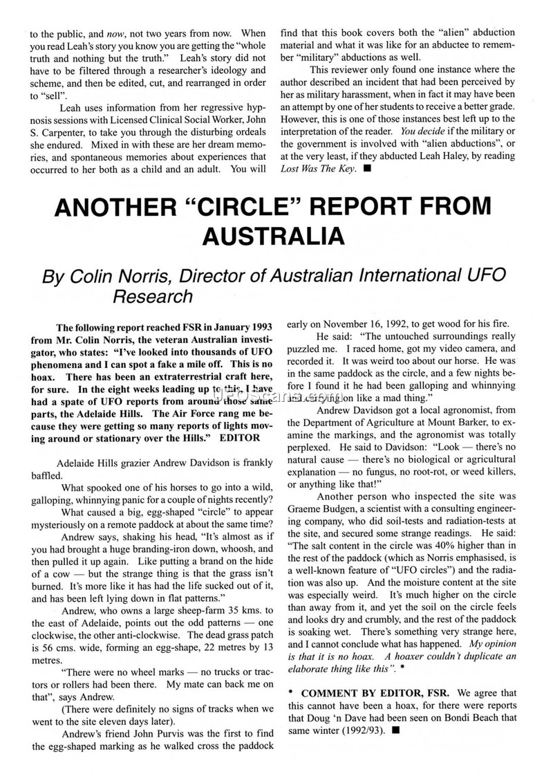 This document is a compilation of reports published in the Flying Saucer Review (FSR), detailing various UAP and crop circle incidents. The first report, authored by Colin Norris of Australian International UFO Research, describes an egg-shaped marking discovered in the Adelaide Hills in November 1992. The site exhibited unusual physical characteristics, including elevated salt content and radiation levels, and was accompanied by reports of distressed livestock. The second section, written by Diana Clift, discusses crop circle phenomena in Siberia, specifically referencing a 1990 incident near Chekarda, Yaroslavl, where witnesses observed a bright, round object and subsequent physical traces in a barley field. The final report, by Gordon Creighton, details a 1988 close encounter in St. Albans, UK, involving Mrs. Rosetta Webly. Mrs. Webly reported observing a large, circular object with red, yellow, and white lights that hovered overhead. She described experiencing a 'zone of silence,' paralysis, and a loss of time during the event. The document serves as a record of these disparate international accounts, emphasizing the recurring nature of these phenomena and the physical and physiological impacts reported by witnesses.