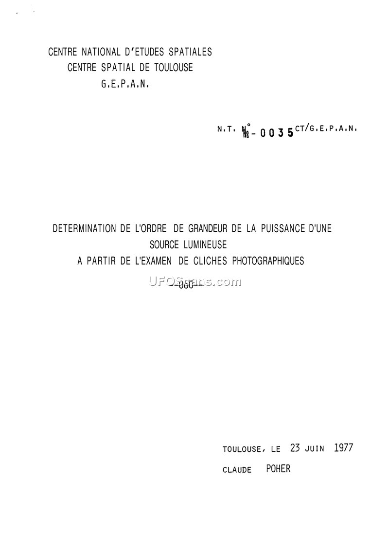 This technical note, issued by the G.E.P.A.N. (Groupe d'Étude des Phénomènes Aérospatiaux Non-identifiés) at the Centre Spatial de Toulouse on June 23, 1977, and authored by Claude Poher, outlines a scientific methodology for determining the order of magnitude of the power of a light source captured on photographic film. The document establishes a mathematical relationship that allows researchers to calculate the electrical power (in watts) that would be required by a standard 2850°K incandescent lamp to produce the same photographic result as the observed light source, assuming isotropic radiation. The formula incorporates several variables: the distance between the source and the camera, the diameter of the source's image on the film, the aperture ratio of the lens, the density of the image on the film, the film's sensitivity (ASA), and the exposure time. The author provides a detailed derivation of the formula, starting from the sensitometric characteristics of the film and the relationship between photographic density and illumination. To facilitate practical application, the document includes a 'rapid calculation method' that utilizes a table of constants (k1) based on film sensitivity, along with secondary constants (k2 and k3) derived from the lens and exposure parameters. The note concludes with a numerical example, demonstrating how to apply these calculations to a hypothetical scenario involving a 400 ASA film, a 50mm focal length lens, and specific exposure settings, resulting in a power estimate of 30.2 watts per square kilometer.