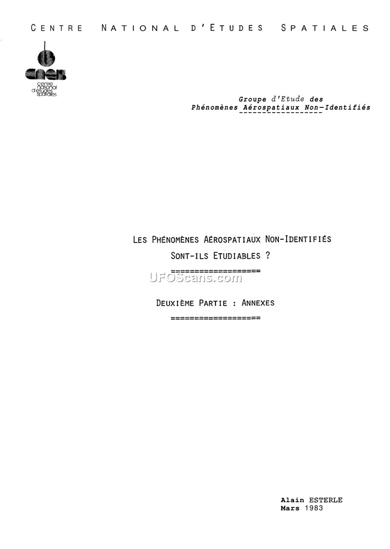 This document, authored by Alain Esterle in March 1983 for the Centre National d'Études Spatiales (CNES) under the GEPAN (Groupe d'Étude des Phénomènes Aérospatiaux Non-Identifiés), serves as the second part (Annexes) of a larger report titled 'Are Unidentified Aerospace Phenomena Studyable?'. The document provides a methodological framework for the scientific investigation of UAP. It posits that UAP research has historically been hampered by speculative and arbitrary discussions. To move toward a rigorous scientific approach, the author proposes a model based on four primary observables: witness testimony, the physical environment (topography, meteorology, etc.), the psychosocial context (cultural and ideological factors), and physical traces. The author illustrates this with a tetrahedron model, where the UAP stimulus sits at the center, and the researcher collects data from the four vertices. The annexes detail specific areas of study, including the difficulty of establishing a stable data corpus, the classification of observations (from identified to non-analyzable), and the role of perception in witness accounts. It also discusses the scientific validity of hypotheses, using the SETI program as a comparison for the extraterrestrial hypothesis, noting that such hypotheses must be refutable to be scientific. Furthermore, the document explores physical phenomena that may be confused with UAP, such as lightning (and its associated electromagnetic signatures and ground traces) and meteors. It highlights the importance of standardized observation networks and the potential for advanced analysis, such as spectral analysis of light sources, to improve the quality of data. The document concludes that while UAP studies are challenging, they can be approached through systematic, multi-faceted data collection and analysis, avoiding the pitfalls of unverified assumptions.