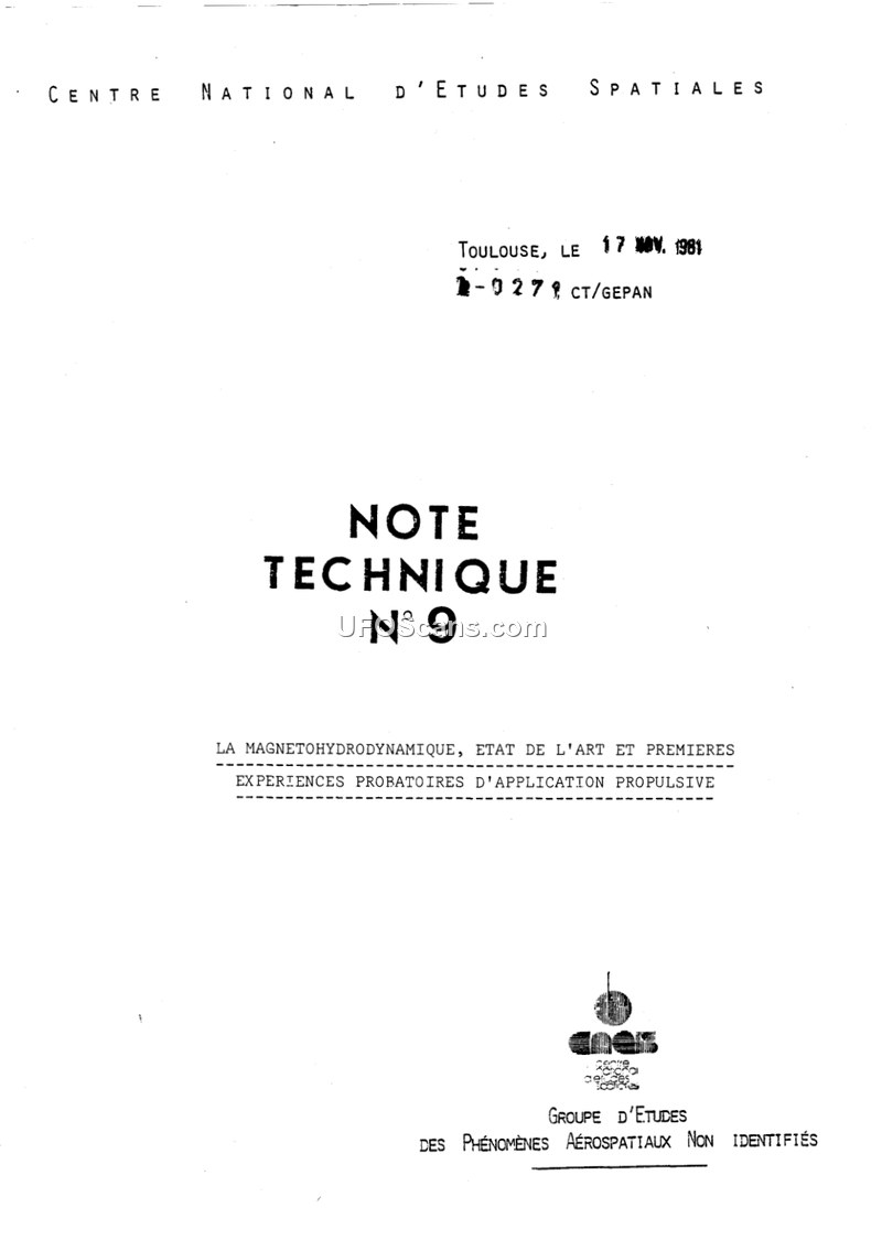 This 1981 GEPAN technical note reviews the state of magnetohydrodynamics (MHD) research and presents experimental evidence that MHD forces can suppress bow waves on cylindrical objects. It explores the potential for these findings to explain the silent, rapid flight characteristics reported in unidentified aerospace phenomena.