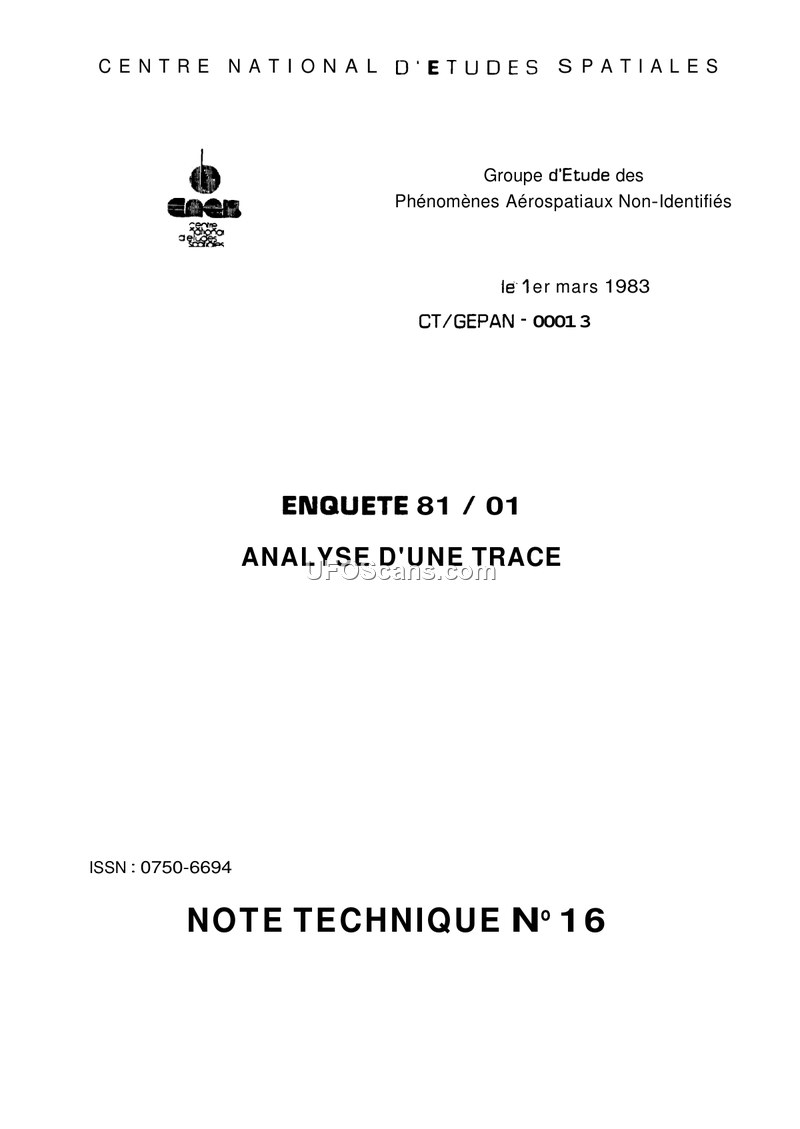 This technical note (N° 16) from the GEPAN (Groupe d'Etude des Phénomènes Aérospatiaux Non-Identifiés) details the investigation of a UAP sighting and associated physical trace that occurred on January 8, 1981, in the commune of Al, France. The witness, a construction worker referred to as Monsieur C, reported observing a dark, ovoid object, resembling two inverted bowls, descend and land on a terrace on his property. The object, which he estimated to be approximately 1.5 meters high and 2.5 meters in diameter, hovered briefly before taking off vertically at high speed. The witness reported a light whistling sound but no other mechanical noise, heat, or vibration. The GEPAN investigation, conducted in February 1981, focused on the physical traces left on the ground and the biochemical analysis of local vegetation. The trace consisted of two concentric circles with a 10cm thick crust, showing signs of mechanical pressure and thermal modification. Laboratory analyses of soil and vegetation samples revealed the presence of zinc, phosphate, and carbon black, suggesting a potential residue from a coating or paint. Biochemical analysis of the vegetation (Medicago minima) showed significant pigment degradation, particularly in chlorophyll and carotenoids, which the GEPAN compared to effects observed in controlled irradiation experiments, though they noted that the specific mechanism remained unclear. The report concludes that while the physical evidence confirms an event of significant magnitude occurred at the site, the data remains insufficient to provide a definitive explanation for the phenomenon itself. The GEPAN highlights the importance of rapid, systematic data collection in such cases and notes that the witness's testimony, while consistent, cannot be independently verified, leaving the investigation as a valuable but inconclusive case study.