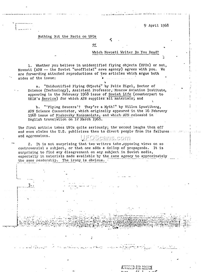 This document, dated April 9, 1968, serves as a commentary on the contradictory nature of Soviet media coverage regarding Unidentified Flying Objects (UFOs). The document notes that the Soviet news agency Novosti (APN) disseminated two distinct and opposing viewpoints to its readership. The first perspective, authored by Felix Zigel, a Doctor of Science and Assistant Professor at the Moscow Aviation Institute, appeared in the February 1968 issue of Soviet Life and treated the UFO phenomenon with scientific seriousness. Conversely, the second perspective, written by APN Science Commentator Villen Lyustiberg, appeared in the February 16, 1968, issue of Moskovsky Komsomolets. Lyustiberg dismissed UFOs as a myth, characterizing them as a tool for Western misinformation and a distraction from U.S. political failures and aggressions. The document includes the full text of these articles, which detail various historical accounts, including the 1947 Kenneth Arnold sighting, the death of Captain Thomas Manthell, and the Tunguska event. The compilation highlights the irony that the same agency, Novosti, provided such disparate materials to the same audience, suggesting that the Soviet approach to the subject was multifaceted and potentially propagandistic. The document concludes by noting that while some Soviet scientists were beginning to investigate the phenomenon, others remained deeply skeptical, viewing the entire discourse as a Western-manufactured sensation.