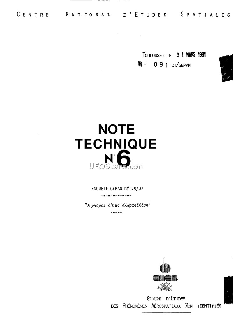 NOTE TECHNIQUE N°6: ENQUETE GEPAN N° 79/07 - A propos d'une disparition