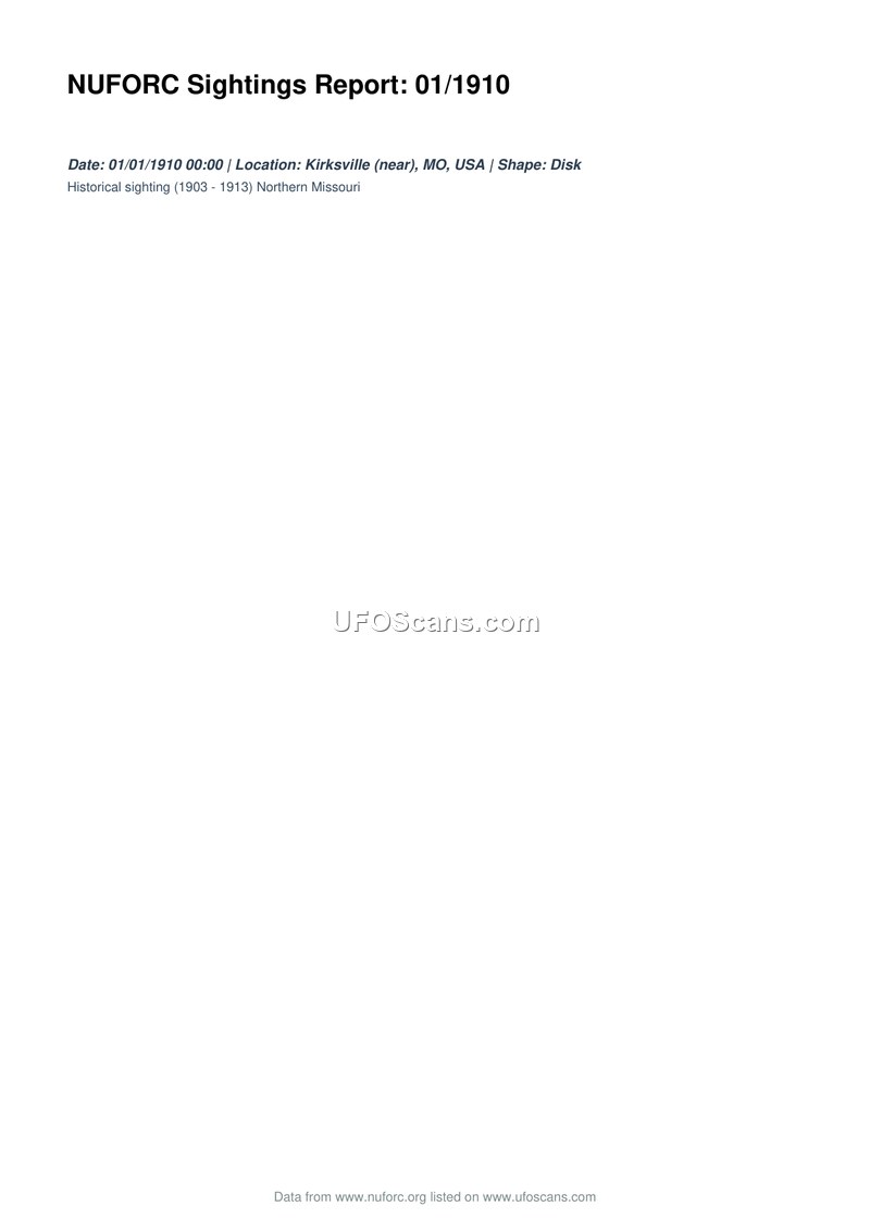 This document records a historical UFO sighting from January 1, 1910, near Kirksville, Missouri. It identifies the object as disk-shaped and places the event within a 1903-1913 regional timeframe.