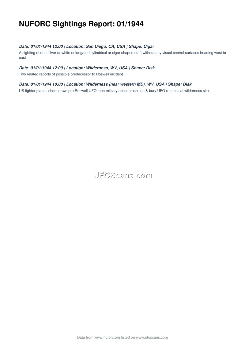 This document, titled 'NUFORC Sightings Report: 01/1944', provides a brief summary of three reported sightings occurring on January 1, 1944. The first report describes a silver or white, elongated, cylindrical or cigar-shaped craft observed in San Diego, California. The report notes that the object lacked any visible control surfaces and was traveling from west to east. The second and third reports concern sightings in Wilderness, West Virginia. The second report identifies the object as a disk and characterizes it as a possible predecessor to the Roswell incident. The third report, also involving a disk-shaped object in the Wilderness area (near western Maryland), alleges that US fighter planes shot down a 'pre-Roswell UFO,' after which the military scoured the crash site and buried the remains.