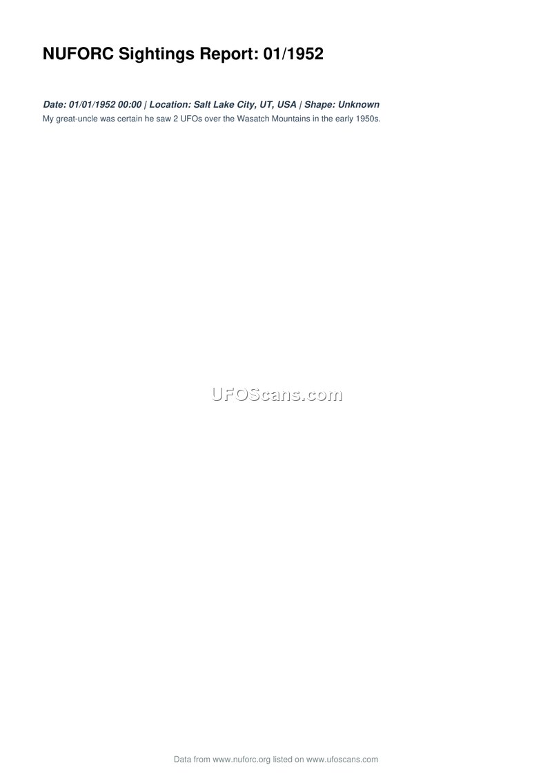 This document is a sighting report compiled by the National UFO Reporting Center (NUFORC) regarding an event dated January 1, 1952. The report details a personal account provided by an individual concerning their great-uncle. According to the testimony, the witness observed two unidentified flying objects (UFOs) while in the vicinity of the Wasatch Mountains in Salt Lake City, Utah. The witness expressed certainty regarding the observation, which reportedly occurred during the early 1950s.