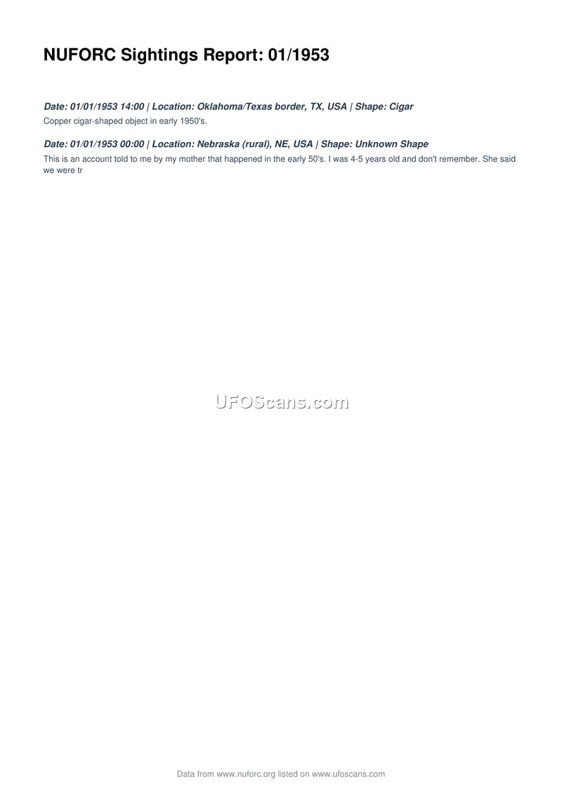 This document, titled NUFORC Sightings Report: 01/1953, provides a brief summary of two separate UFO sighting accounts from the early 1950s. The first incident occurred on January 1, 1953, at 14:00 hours near the Oklahoma/Texas border. The witness reported observing a copper-colored, cigar-shaped object. The second incident, also dated January 1, 1953, at 00:00 hours, took place in a rural area of Nebraska. This account was relayed to the reporter by their mother, describing an event that occurred when the reporter was approximately four or five years old. The report notes that the reporter has no personal memory of the event, and the text cuts off while describing the mother's account.