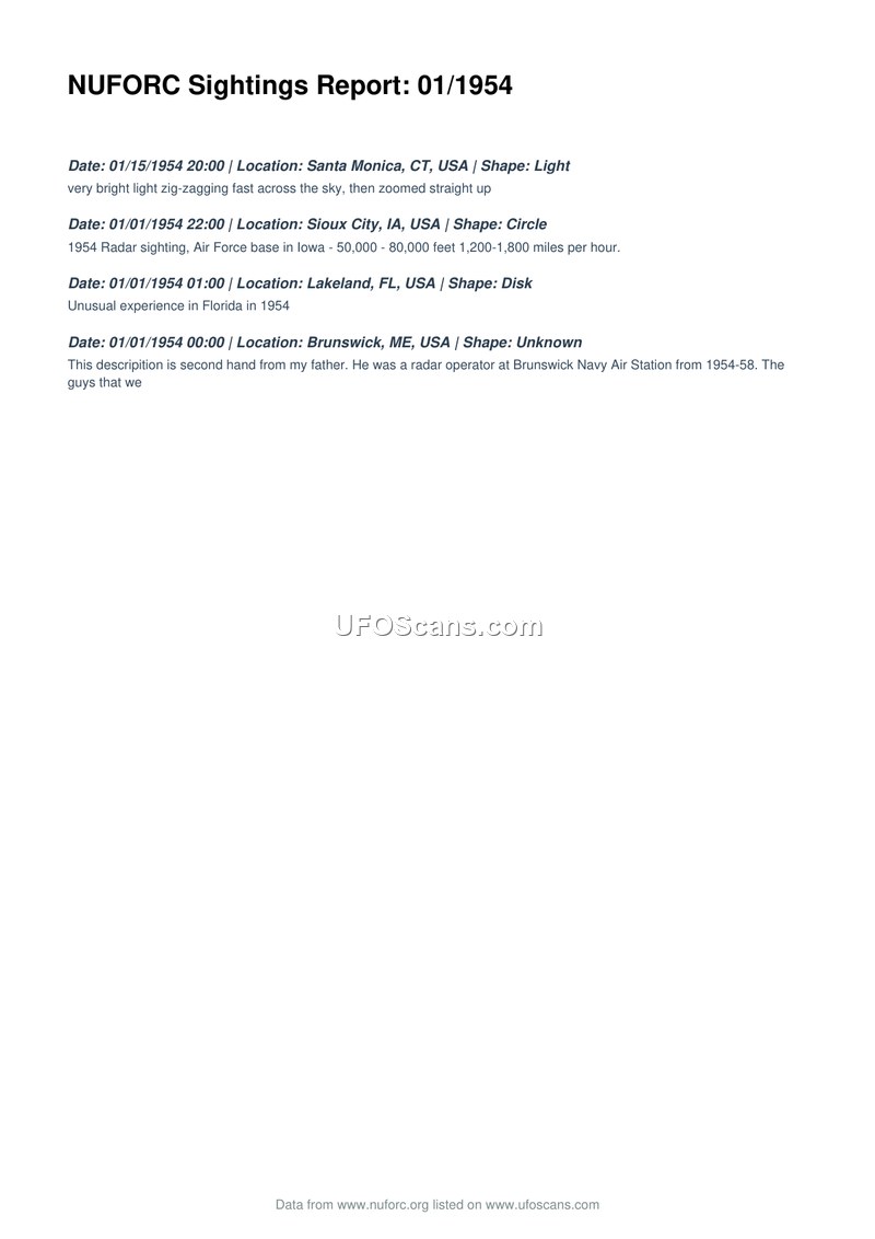 This document, titled 'NUFORC Sightings Report: 01/1954', provides a brief compilation of four distinct unidentified aerial phenomena reports occurring in January 1954. The first incident occurred on January 15, 1954, in Santa Monica, Connecticut, where a light was observed zig-zagging before moving vertically. The second report details a radar sighting on January 1, 1954, at an Air Force base in Sioux City, Iowa, involving an object at an altitude of 50,000 to 80,000 feet traveling at speeds between 1,200 and 1,800 miles per hour. The third entry describes an unusual experience in Lakeland, Florida, on January 1, 1954, involving a disk-shaped object. The final entry concerns a report from Brunswick, Maine, on January 1, 1954, which is described as a second-hand account from a radar operator stationed at the Brunswick Navy Air Station between 1954 and 1958.