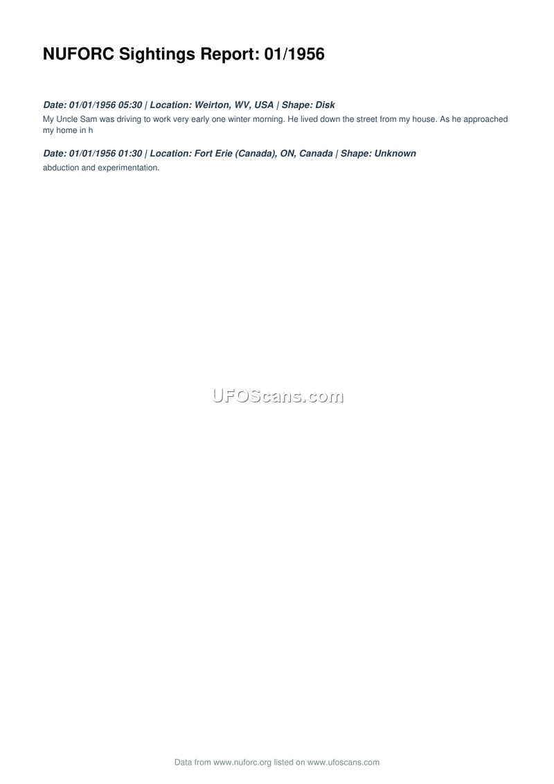 This document is a compilation of two UFO sighting reports from January 1, 1956, sourced from the National UFO Reporting Center (NUFORC). The first incident occurred at 05:30 in Weirton, West Virginia, involving a disk-shaped object. The witness, identified as the author's uncle, was driving to work on a winter morning when he encountered the object near his home. The second incident occurred at 01:30 in Fort Erie, Ontario, Canada. This report involves an unknown object shape and mentions abduction and experimentation, though the text is truncated.