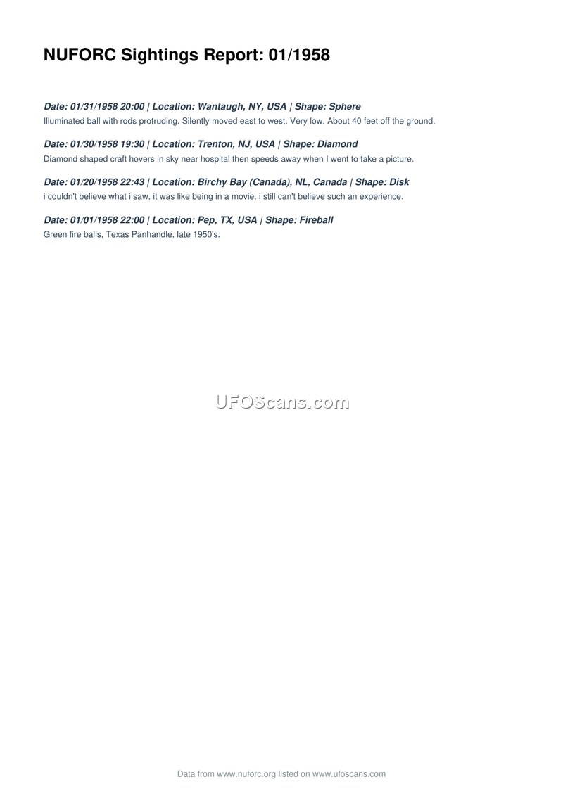 This document, titled 'NUFORC Sightings Report: 01/1958', provides a summary of four distinct aerial phenomena sightings reported during the month of January 1958. The first incident occurred on January 31, 1958, in Wantaugh, New York, where a witness observed an illuminated sphere with protruding rods moving silently from east to west at a low altitude of approximately 40 feet. The second incident took place on January 30, 1958, in Trenton, New Jersey, involving a diamond-shaped craft that hovered near a hospital before departing rapidly when the witness attempted to photograph it. The third report is from January 20, 1958, in Birchy Bay, Newfoundland, Canada, where a disk-shaped object was observed, prompting the witness to describe the experience as being like a scene from a movie. The final entry records green fireballs observed in the Texas Panhandle on January 1, 1958. The document serves as a compilation of these reports, with data sourced from the National UFO Reporting Center (NUFORC) and listed on the website ufoscans.com.