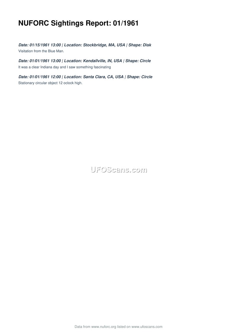 This document, titled 'NUFORC Sightings Report: 01/1961', provides a brief summary of three distinct unidentified aerial phenomena sightings reported during January 1961. The first entry, dated January 15, 1961, at 13:00, occurred in Stockbridge, Massachusetts, involving a disk-shaped object and a reported 'visitation from the Blue Man.' The second entry, dated January 1, 1961, at 13:00, took place in Kendallville, Indiana, where a circle-shaped object was observed on a clear day. The final entry, also dated January 1, 1961, at 12:00, occurred in Santa Clara, California, involving a stationary circular object observed at 12 o'clock high. The document serves as a compilation of these reports, citing data from the National UFO Reporting Center (NUFORC).
