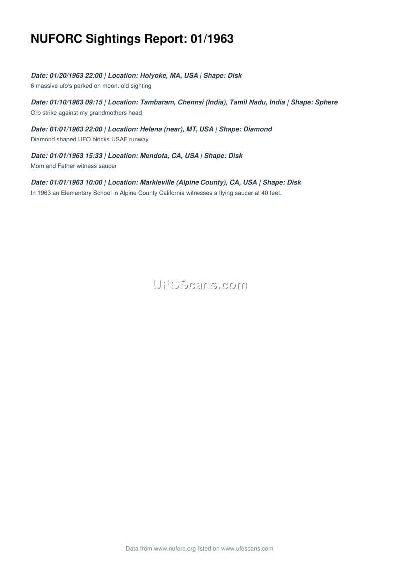 This document, titled 'NUFORC Sightings Report: 01/1963', provides a chronological list of five unidentified aerial phenomena sightings reported for the month of January 1963. The report details incidents occurring in various locations, including Holyoke, Massachusetts; Tambaram, Chennai, India; Helena, Montana; Mendota, California; and Markleville, Alpine County, California. The sightings involve objects described as disks, spheres, and diamonds. Specific details provided for these events include: six massive UFOs parked on the moon on January 20; an orb strike against a witness's grandmother in India on January 10; a diamond-shaped UFO blocking a USAF runway in Montana on January 1; a saucer witnessed by parents in Mendota, California, on January 1; and an elementary school in Alpine County, California, witnessing a flying saucer at 40 feet on January 1.